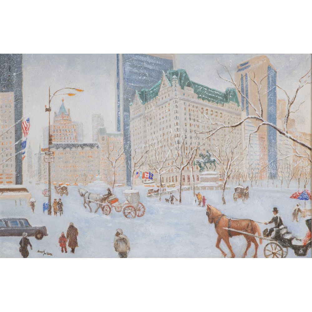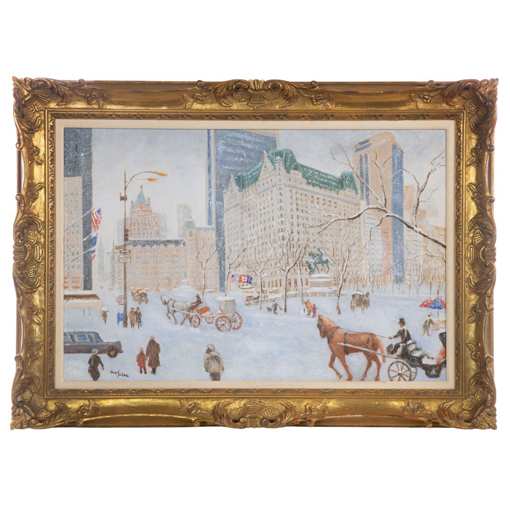Undated, signed, depiction of a winter scene of the Plaza Hotel in New York City, in a gold-tone gesso on wood frame