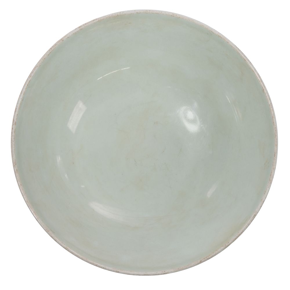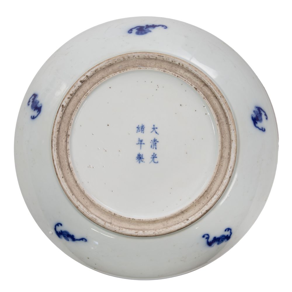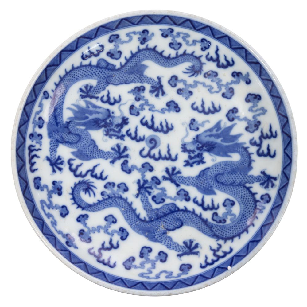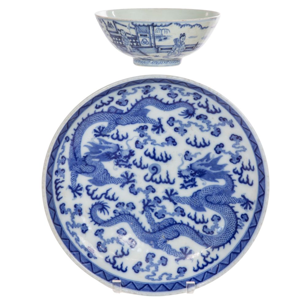 (2) items including a wide, low bowl having dragons amid clouds and lingzhi fungus, an underglaze blue 6-character Guangxu mark underside and an unmarked bowl having underglaze blue decoration depicting figures in a garden to exterior and a plain interior