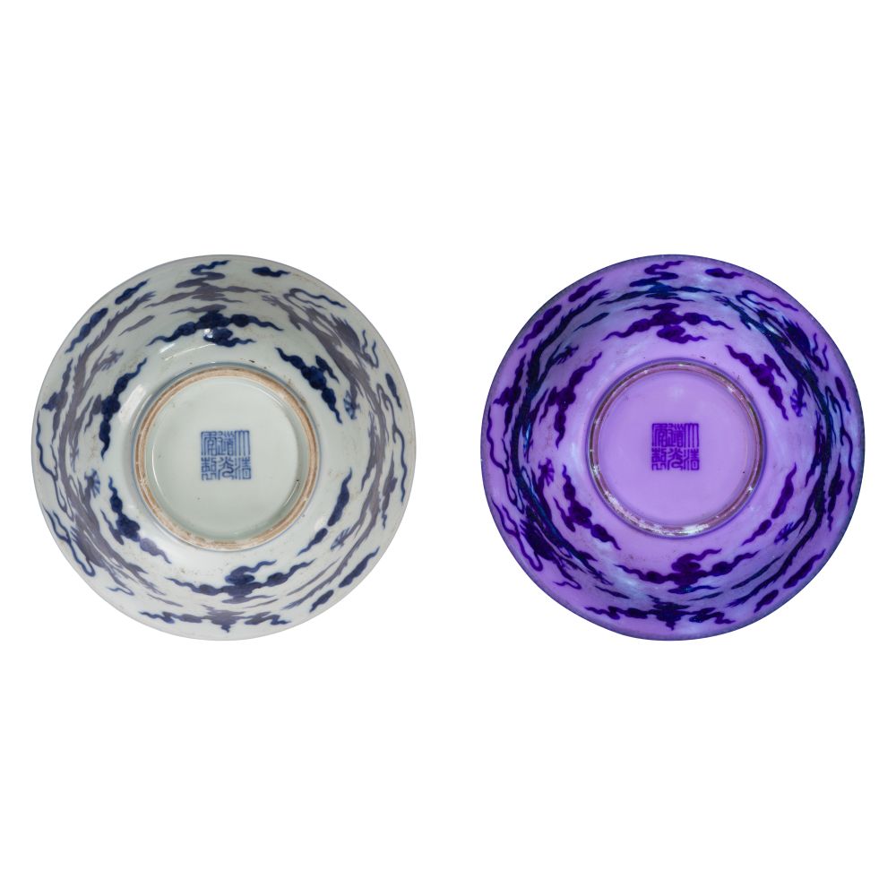A pair having underglaze blue dragon and cloud decoration, Daoguang archaic seal mark to undersides
