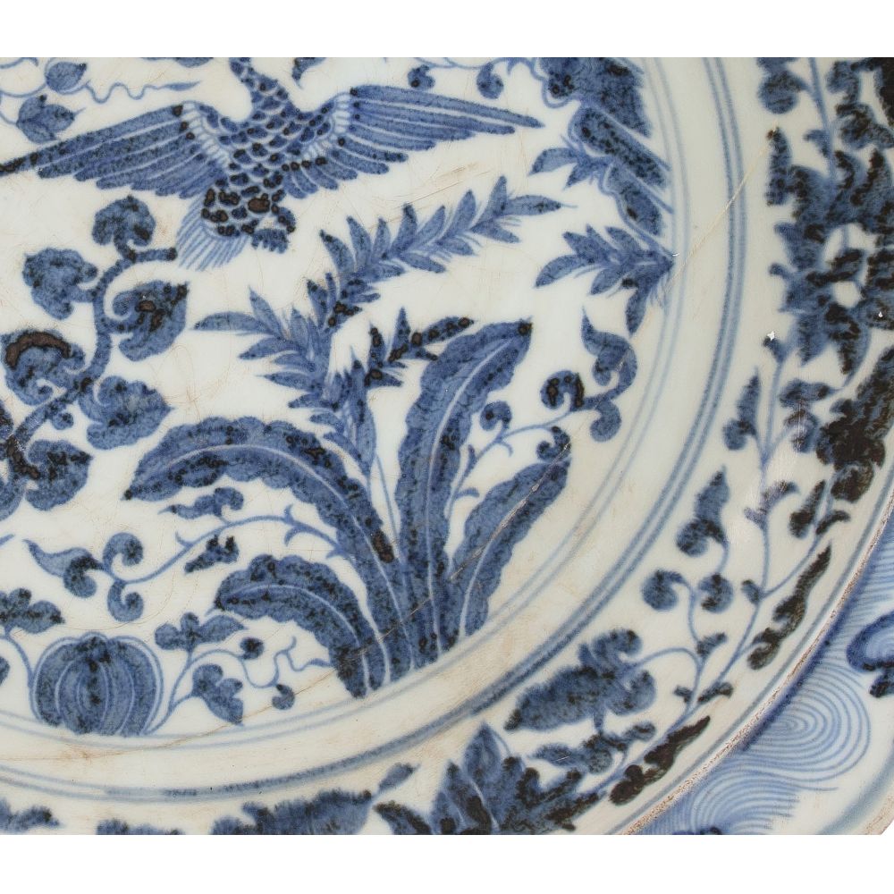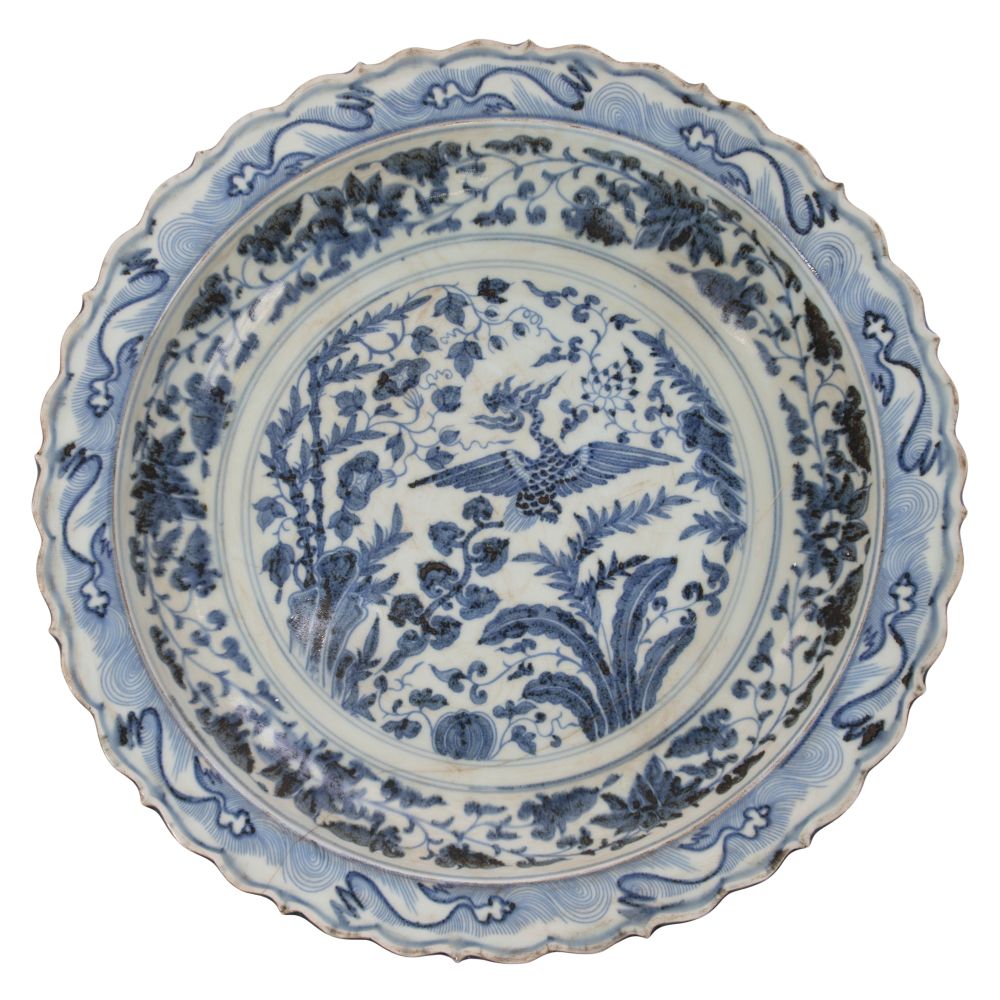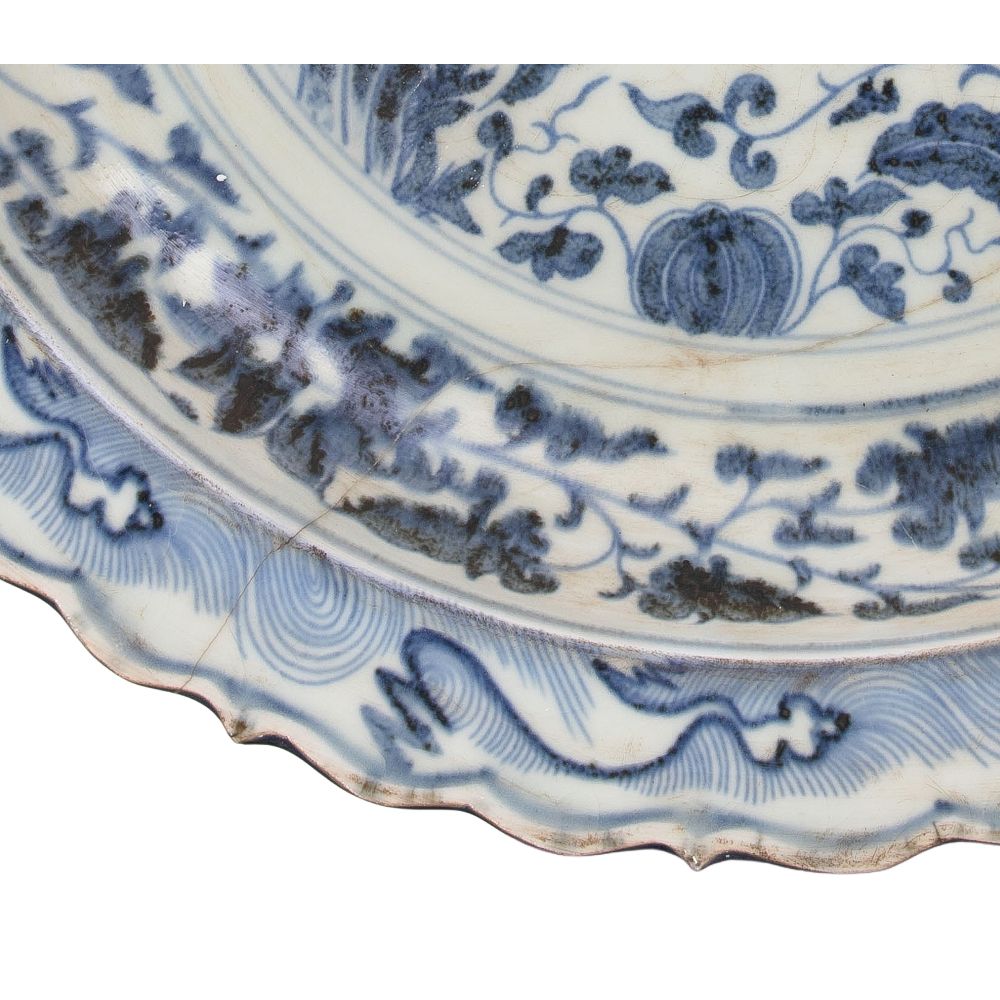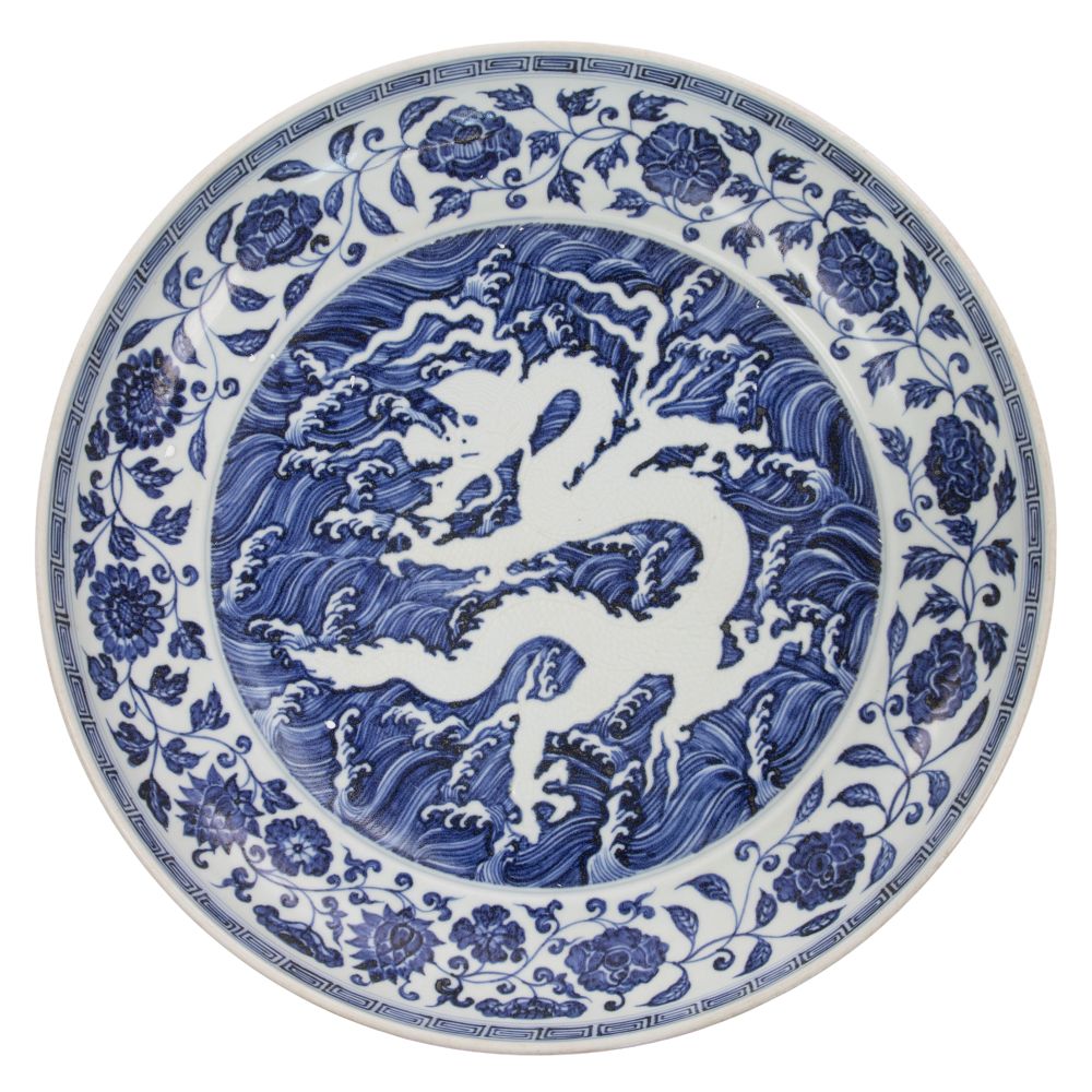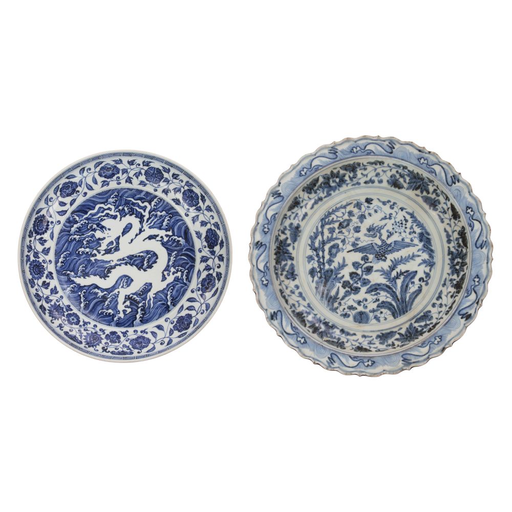 (2) items including a Ming style having reserve white carved dragon amid underglaze blue waves centering floral and geometric bands and a Yuan style having underglaze blue phoenix and floral decoration and wave motif decorated scalloped rim, both unmarked