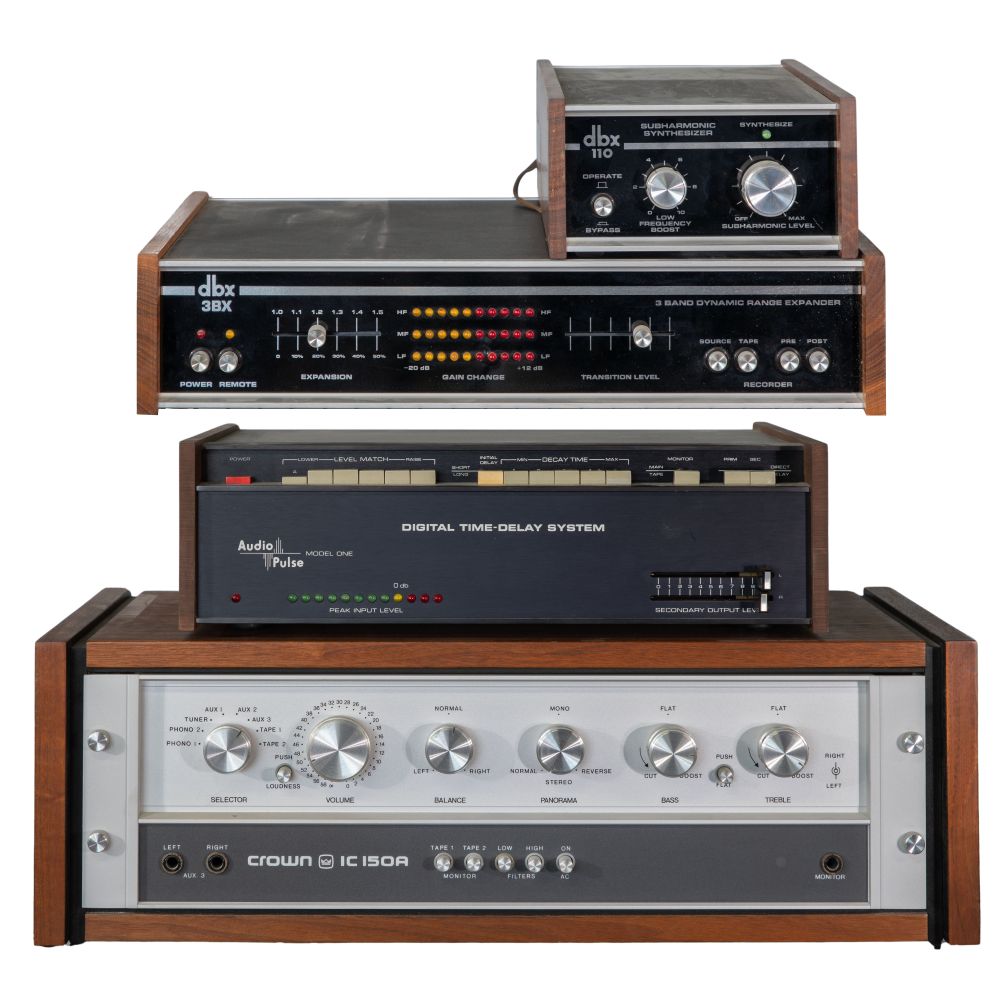 (4) items including a DBX model #3BX serial #18631 three-band range enhancer, a DBX model #110 serial #2719 sub-harmonic synthesizer, an Audio Pulse Model One serial #09926 digital time-delay system and a Crown model #IC-150 A serial #22991 stereo console, all having instruction manuals