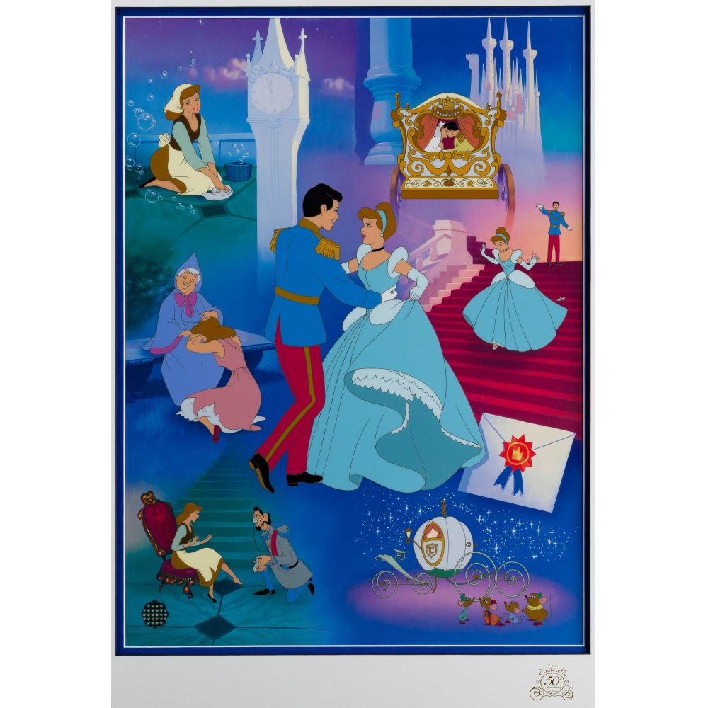 Dimensions: Height: 16 inches, Width: 21 1/2 inches (largest, Cinderella); Frame Height: 23 1/2 inches, Frame Width: 21 1/2 inches