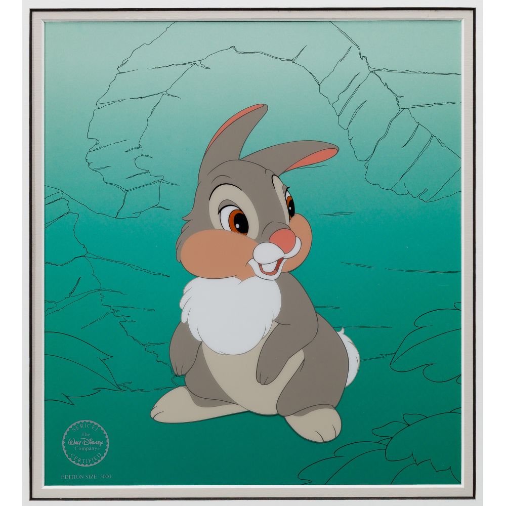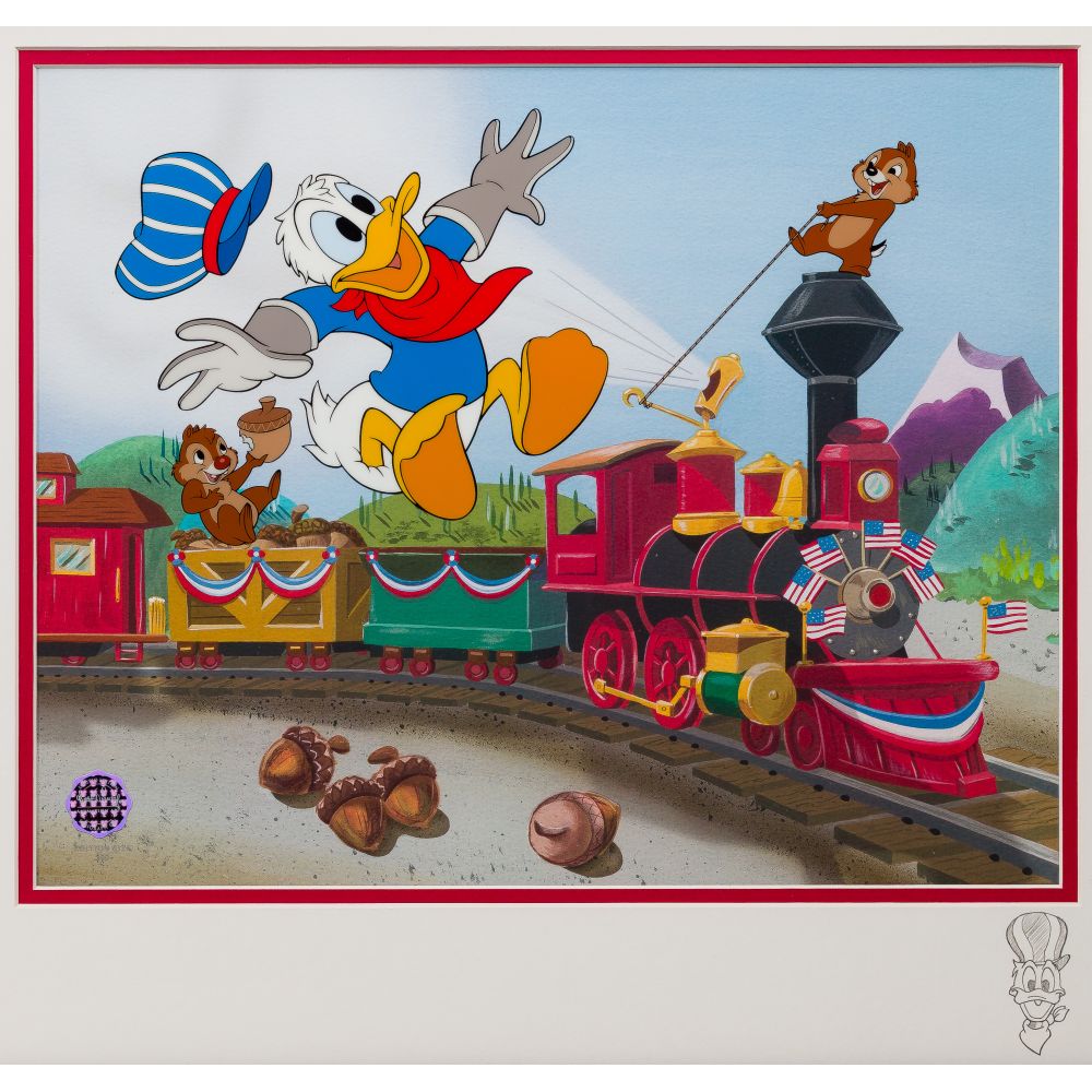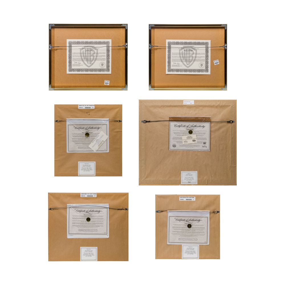 (6) total items including “Fishing For a Kiss” from Pinocchio, “They Call Me Thumper” and “Deer to My Heart” from Bambi, all in original boxes, and Donald Duck and Chip and Dale in “Train Gang”, no box; together with (2) Warner Brothers sericels, all framed under acrylic