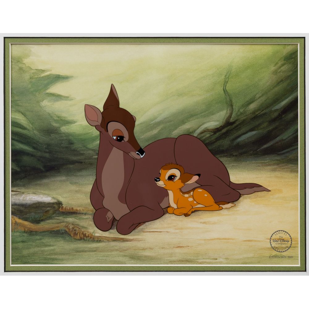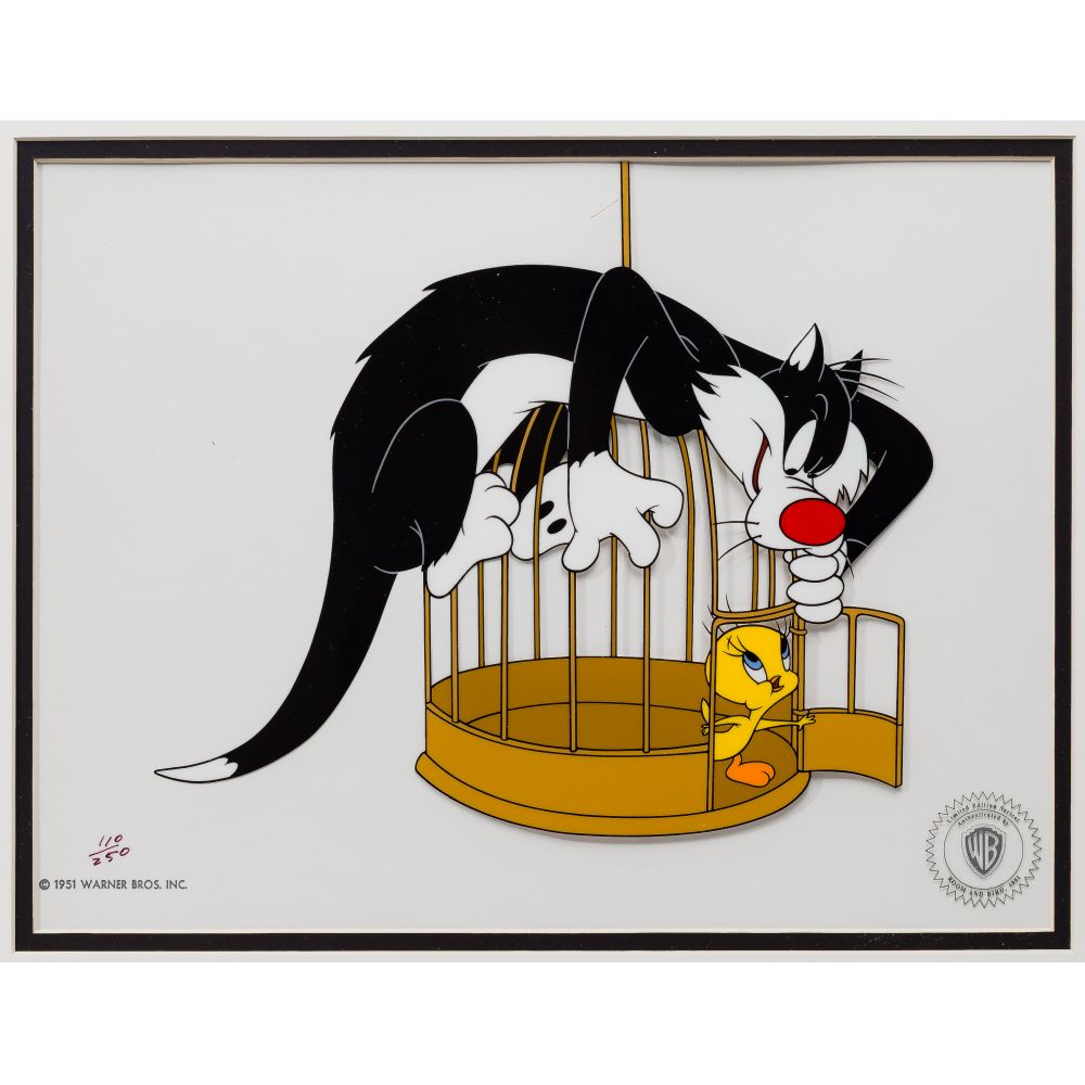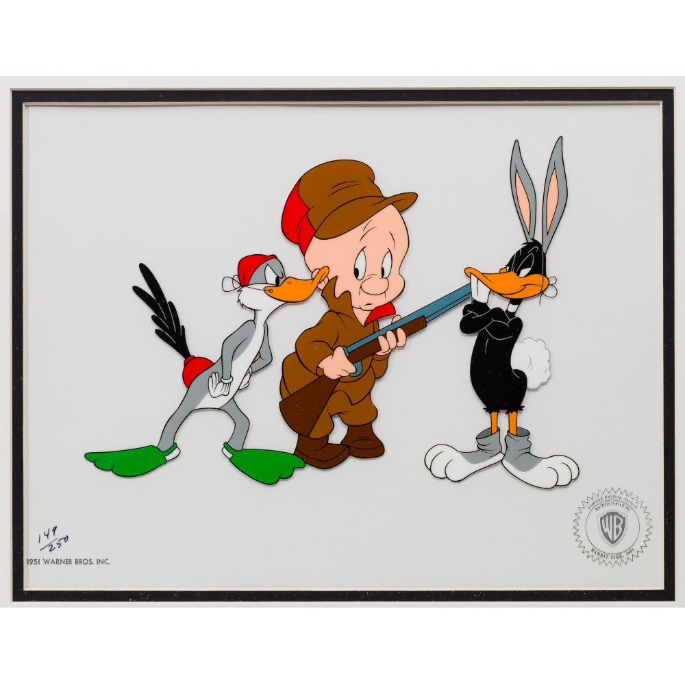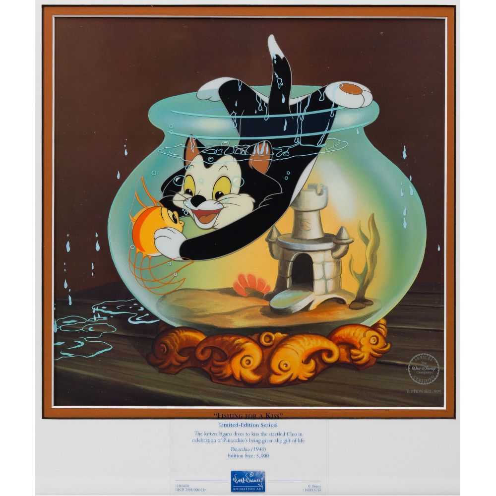 (6) total items including “Fishing For a Kiss” from Pinocchio, “They Call Me Thumper” and “Deer to My Heart” from Bambi, all in original boxes, and Donald Duck and Chip and Dale in “Train Gang”, no box; together with (2) Warner Brothers sericels, all framed under acrylic