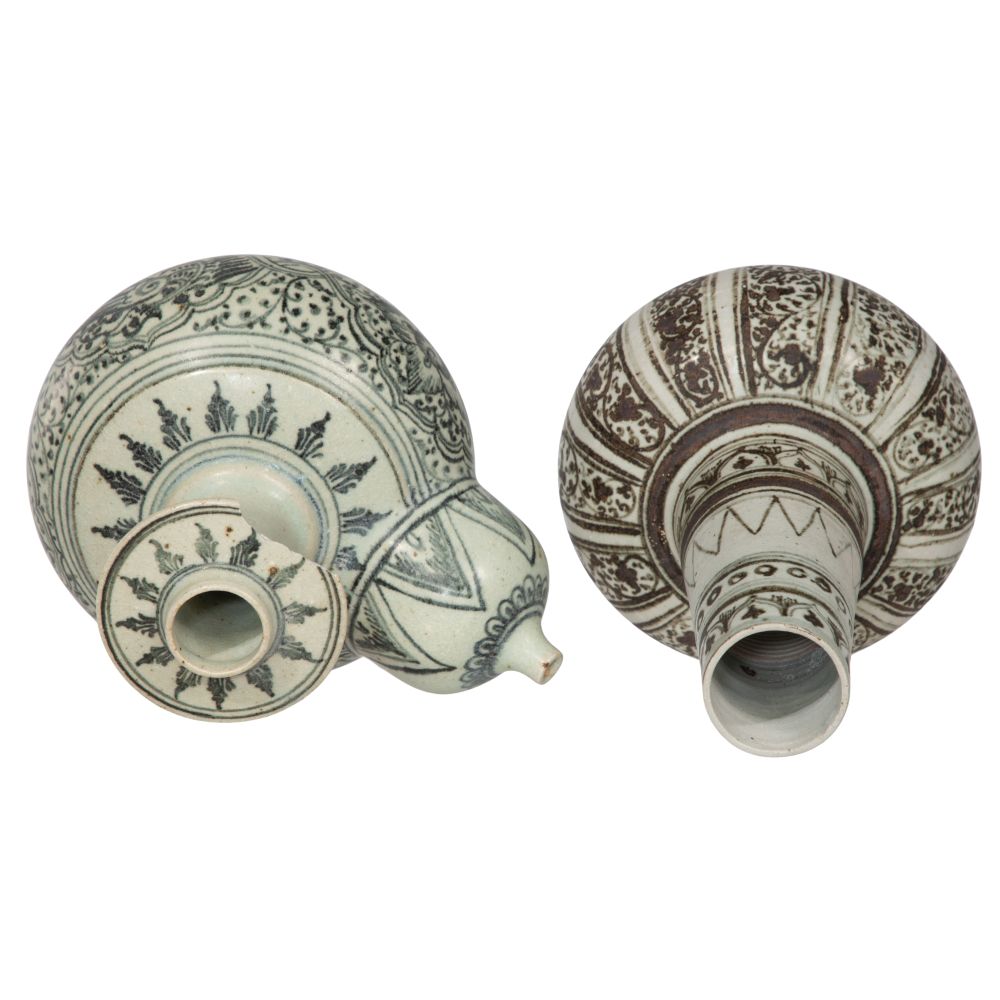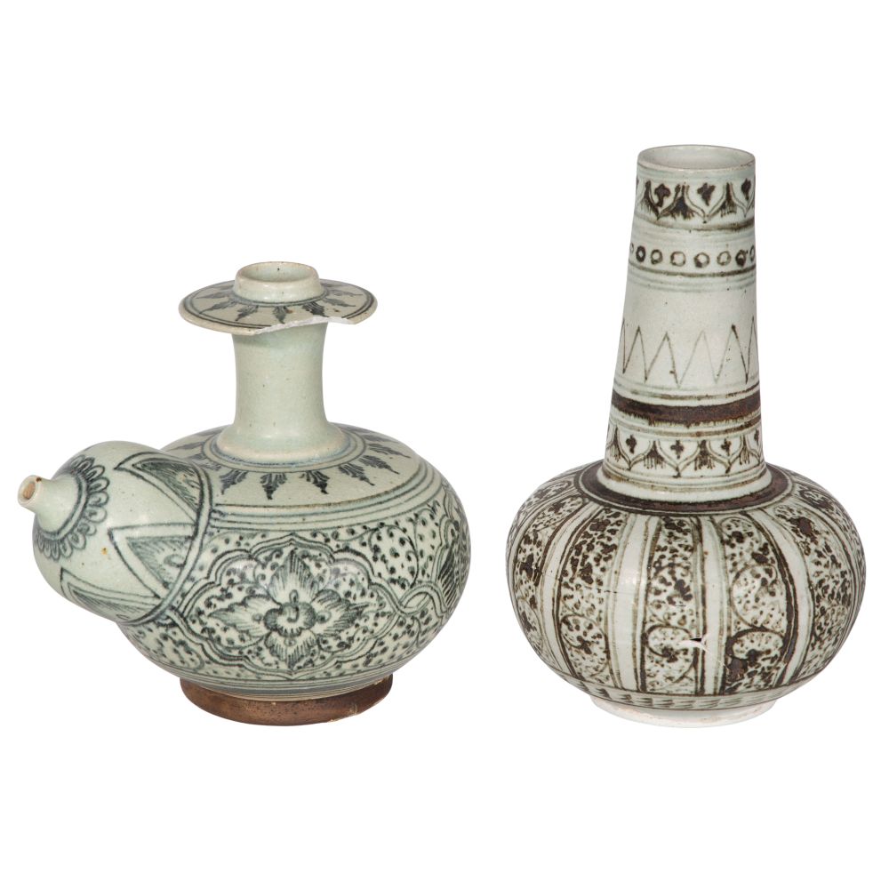 Condition: overall light to moderate wear consistent with age and normal use, minor nicks overall, top of Kendi broken, vase having hole and crack on side, overall light to moderate wear consistent with age and normal use, minor nicks overall, top of Kendi broken, vase having hole and crack on side