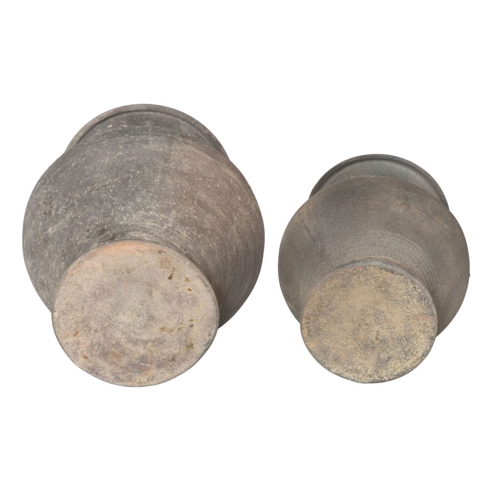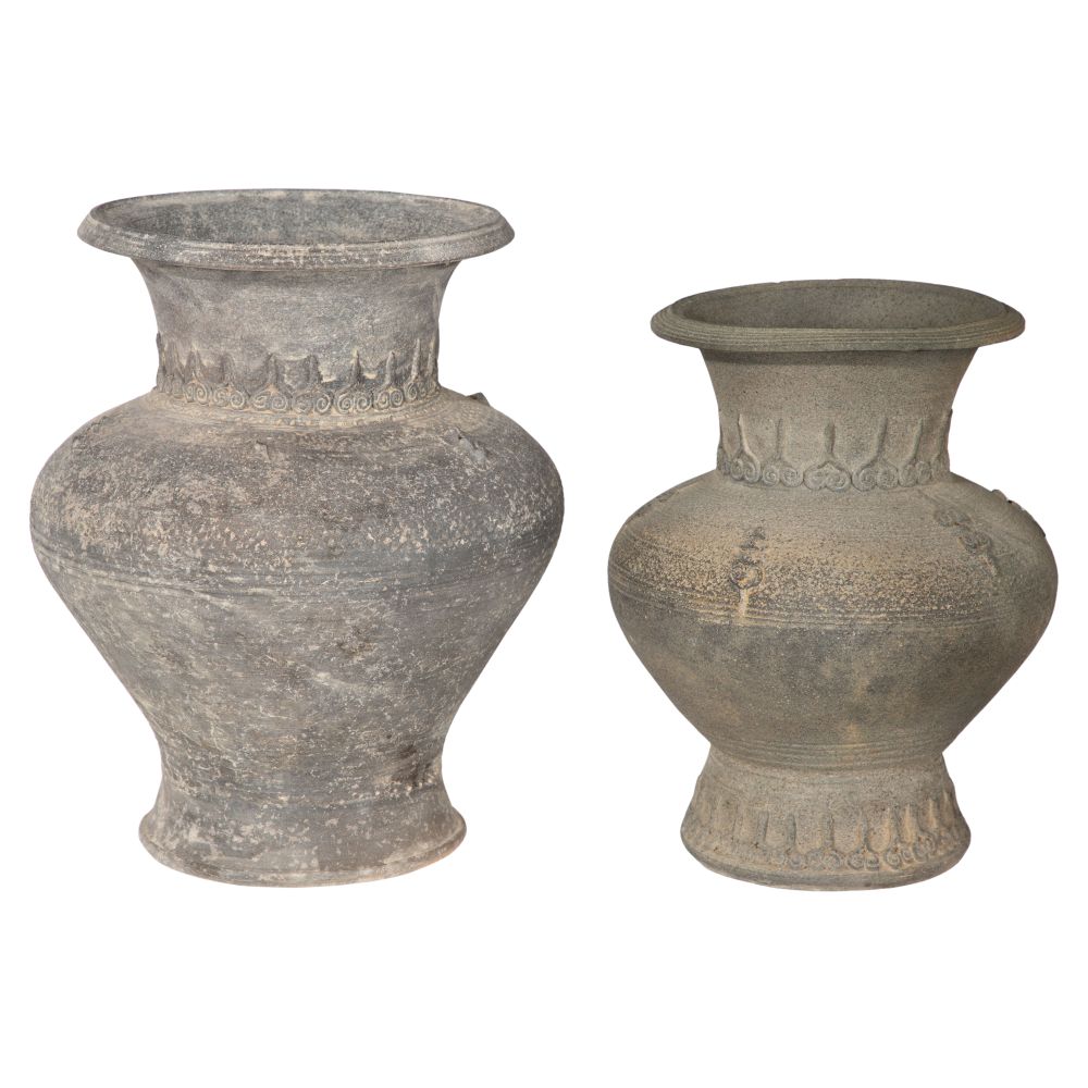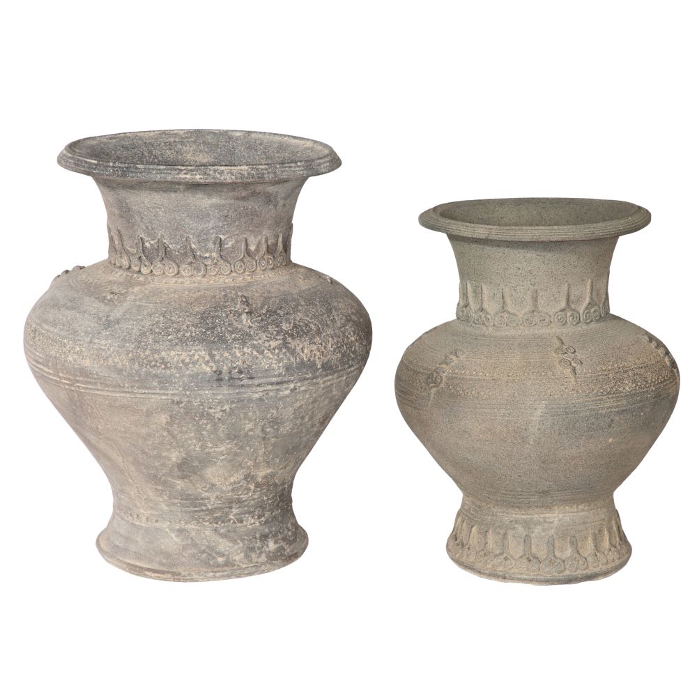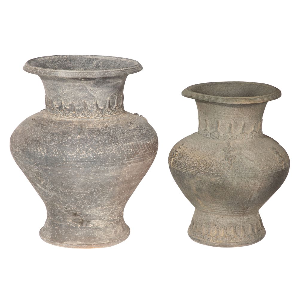 (2) items including a larger and smaller buffware pottery jars having robust shoulders, flared walls, flared circular bases and a band of petite embellishments adorning the shoulder edge