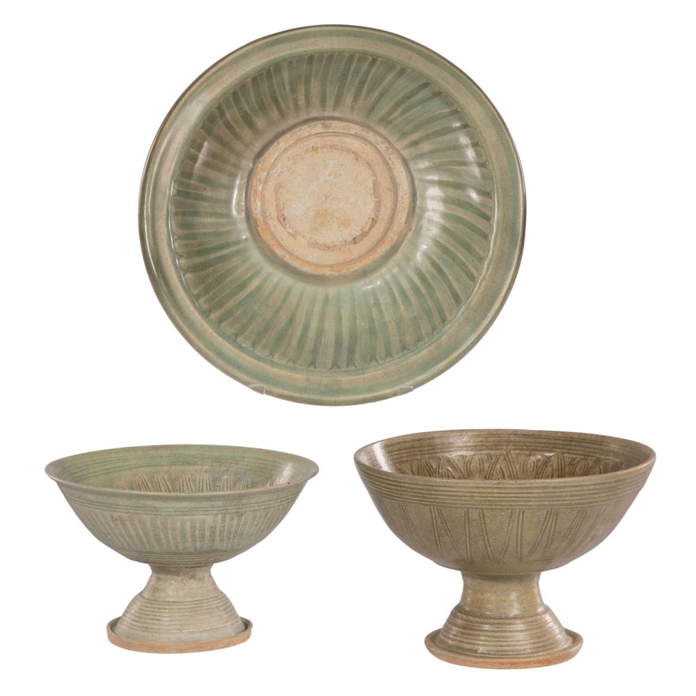 (3) celadon items including a Sawankhalok bowl having an incised motif and (2) footed bowls having incised motif