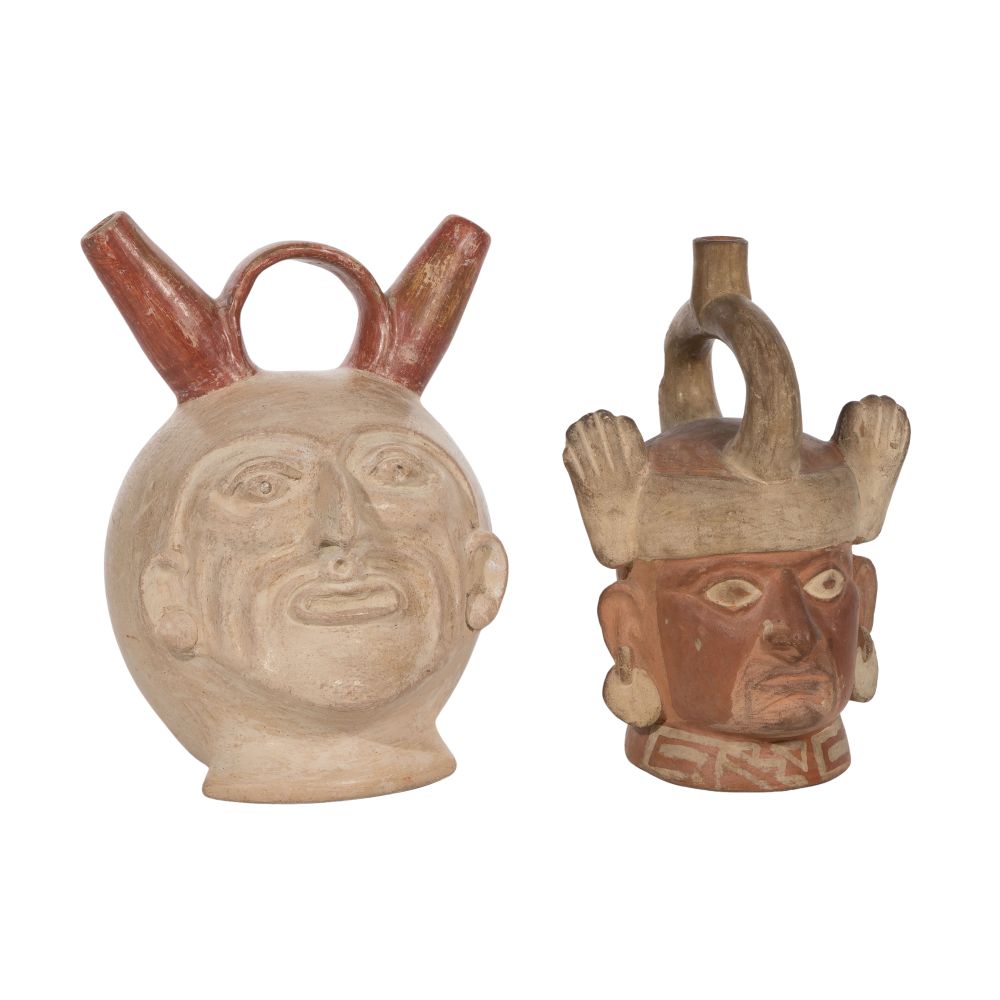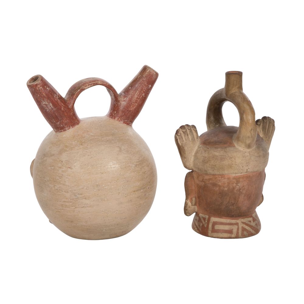 LOT #437 - Pre-Columbian Peruvian Moche Style Painted Pottery Stirrup Bottles
