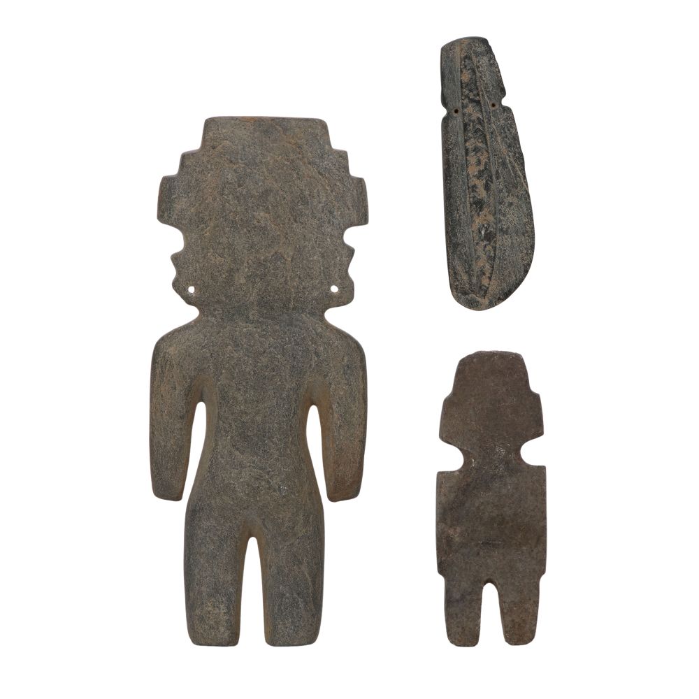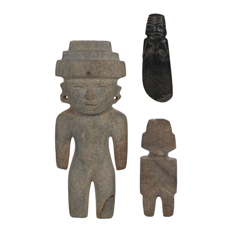 (3) items including a Teotihuacan figurine having ink numeric collection inventory mark and (2) axe gods including a Guerrero Mezcala style and a Costa Rican