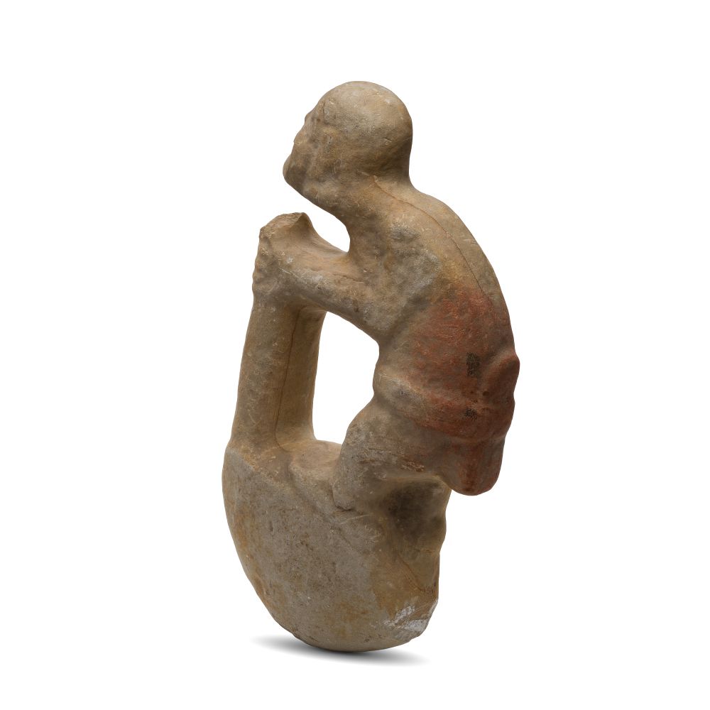 A depiction of a loincloth-wearing figure (perhaps elderly) leaning on a staff, supported on a rounded base which would have been sunk into the ground