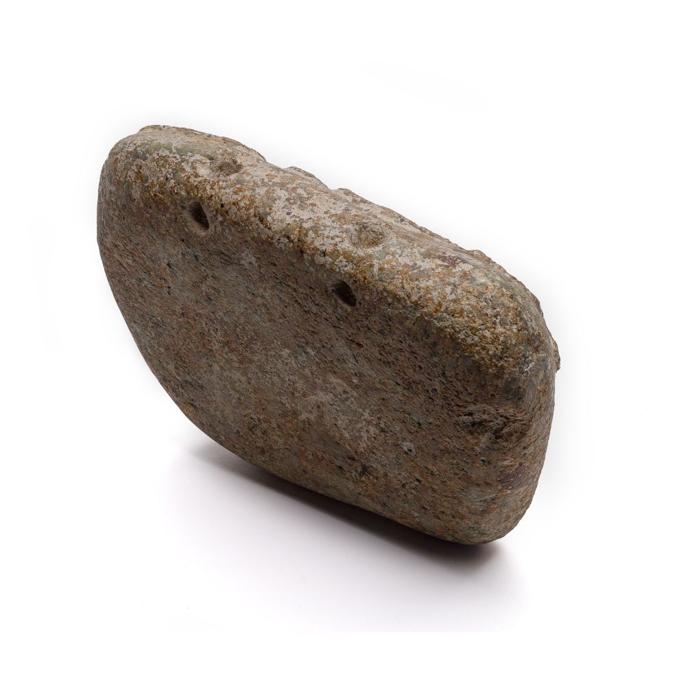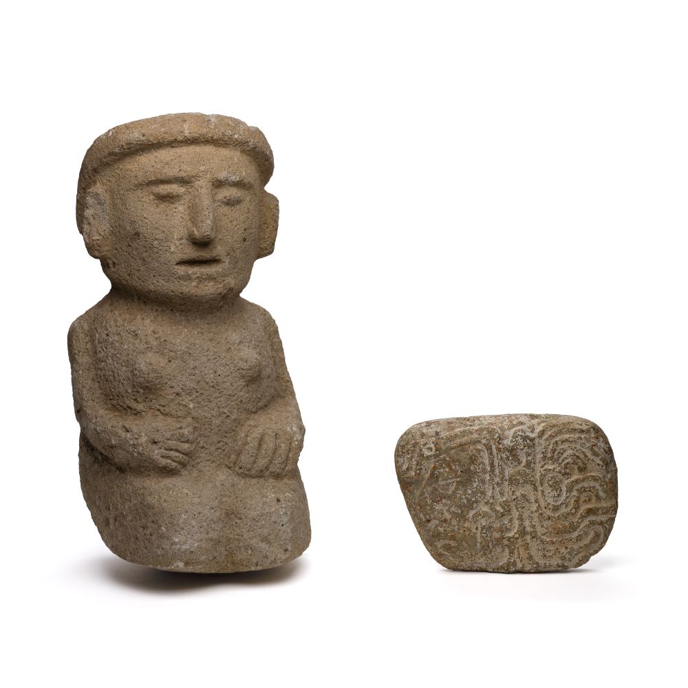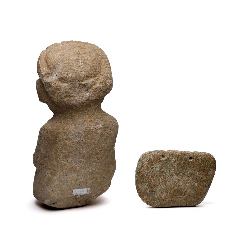 (2) items including a Mayan oversize pendant (or weight) having biconically drilled suspension holes and relief carving depicting a dignitary wearing a plumed headdress as well as a Costa Rican figural statue