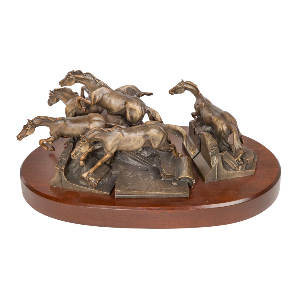 1999, signed in casting, depicting jumping horses, on a wooden base