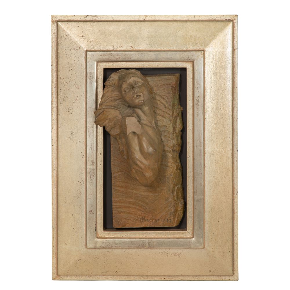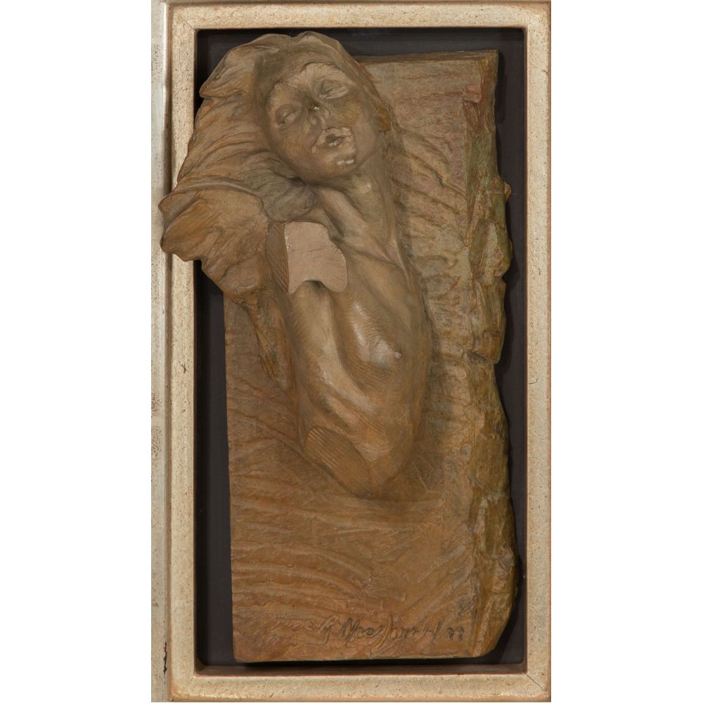 1999, incise signed, depicting a feminine form, mounted in a gold-tone wood frame