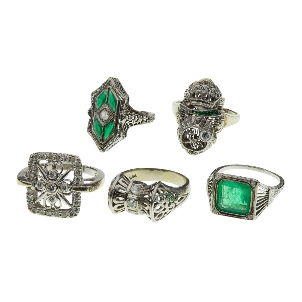 (5) rings including (2) diamond and emerald accented having filigree settings, a square setting having diamond accents, a bow setting having three round cut diamonds in the center and a square cut emerald in a pierced cut setting (most marked “14k”)