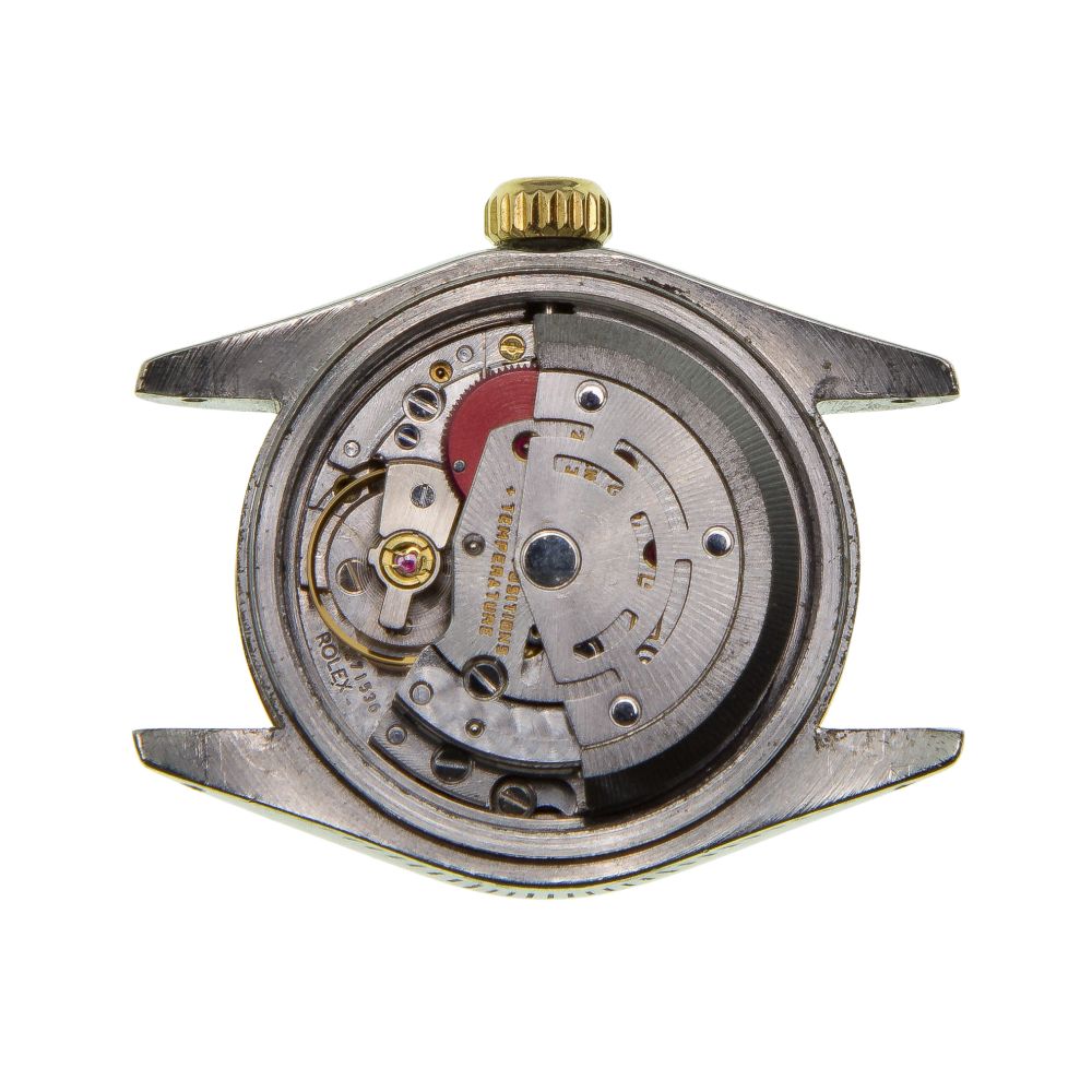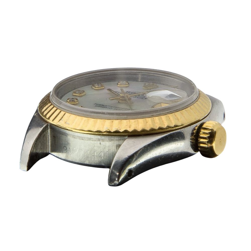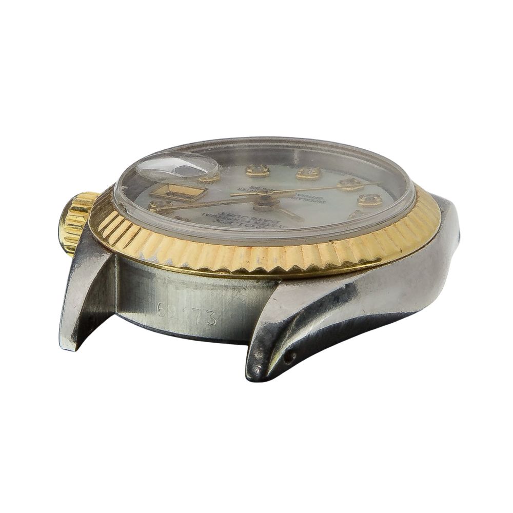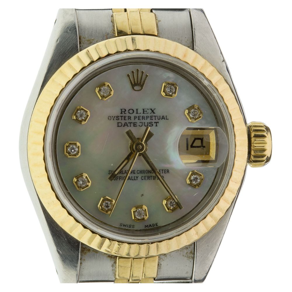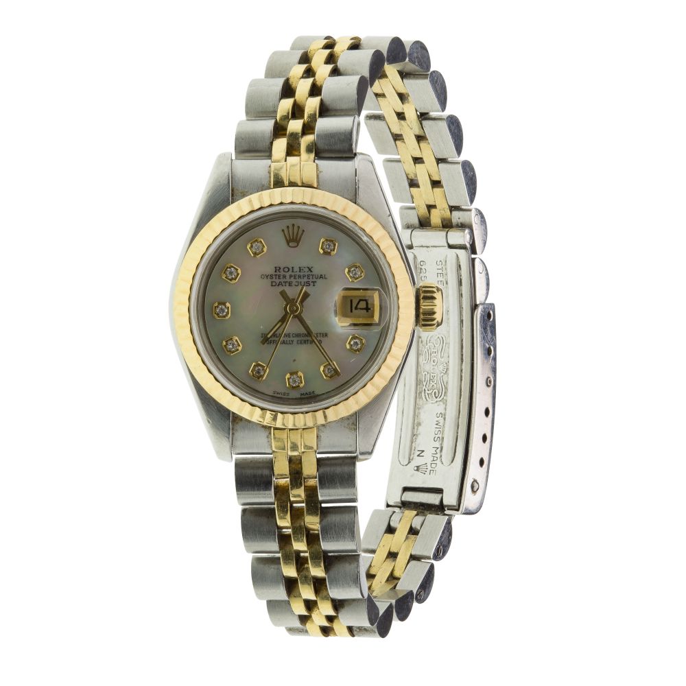 Reference #69173, serial #9027144, mother-of-pearl diamond dial, date at 3 having cyclops lens, instantaneous date setting, fluted bezel, self-winding automatic, a superlative chronometer certified and a two-tone stainless band having deployment clasp