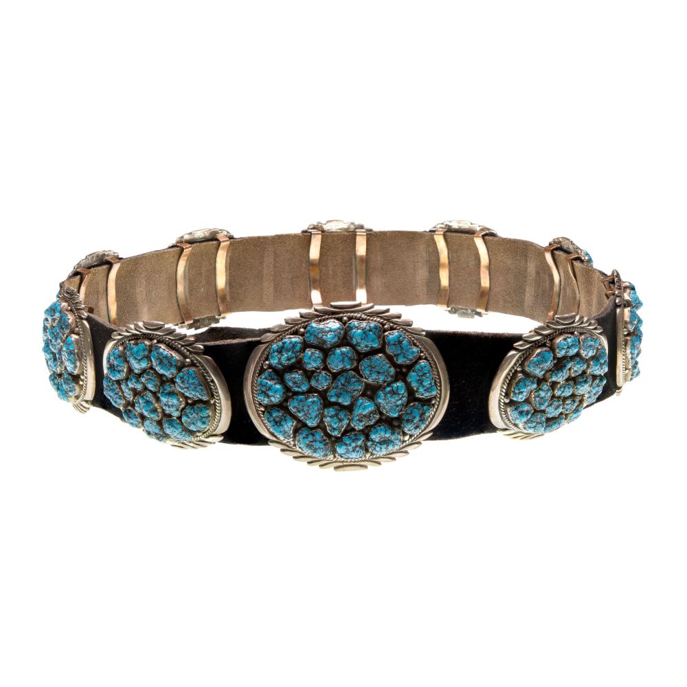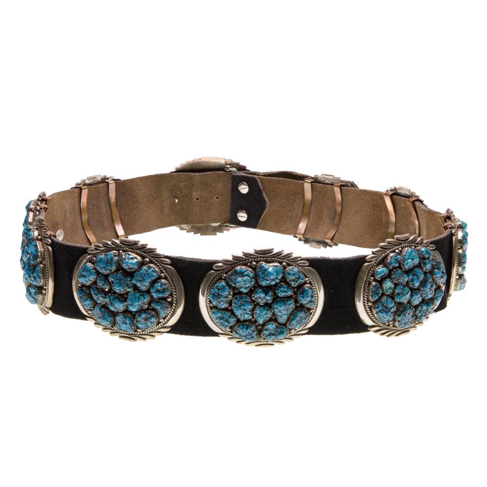 Black leather having a belt buckle and nine conchos with copper back straps, all having free form blue turquoise (marked “sterling” and “LM” back of belt buckle)