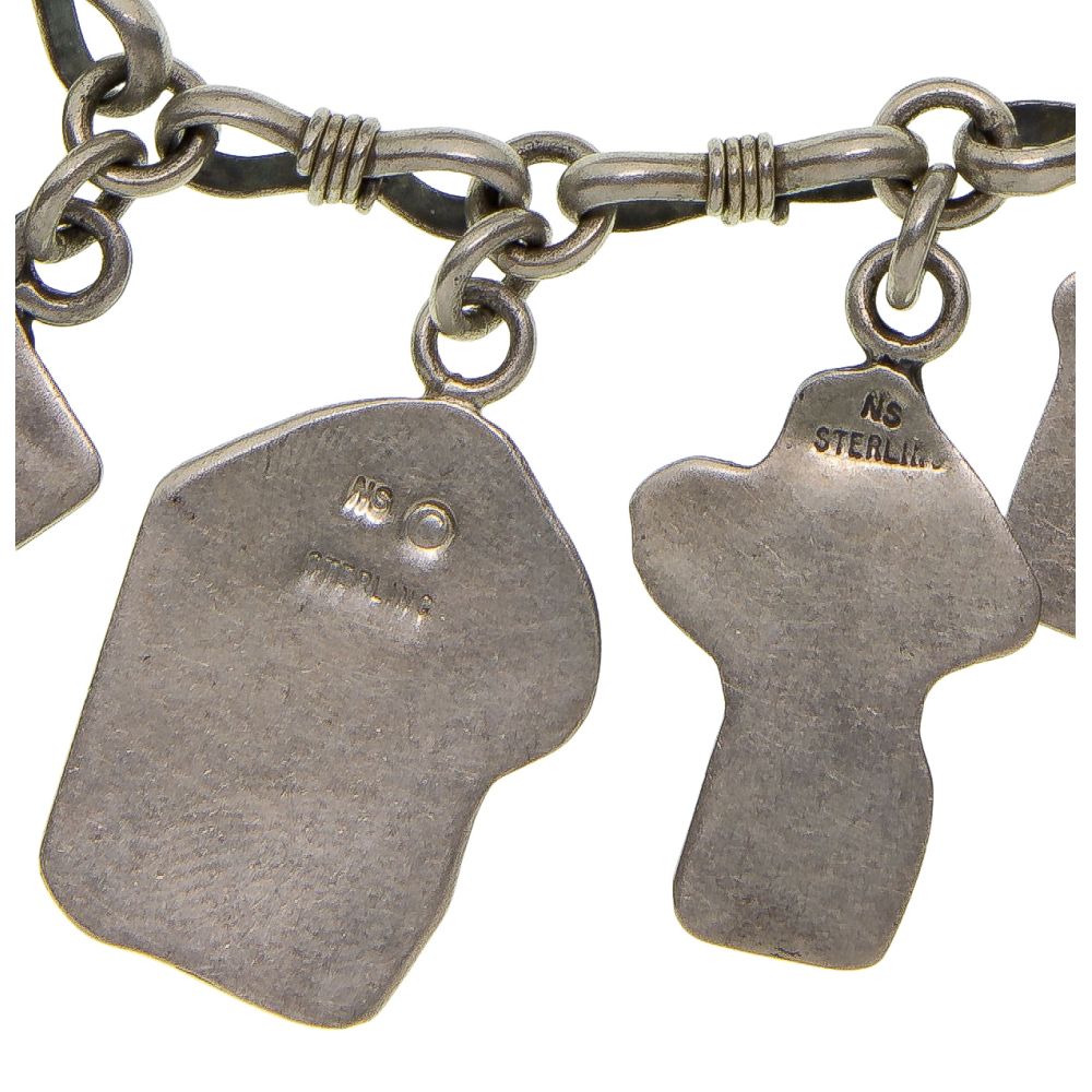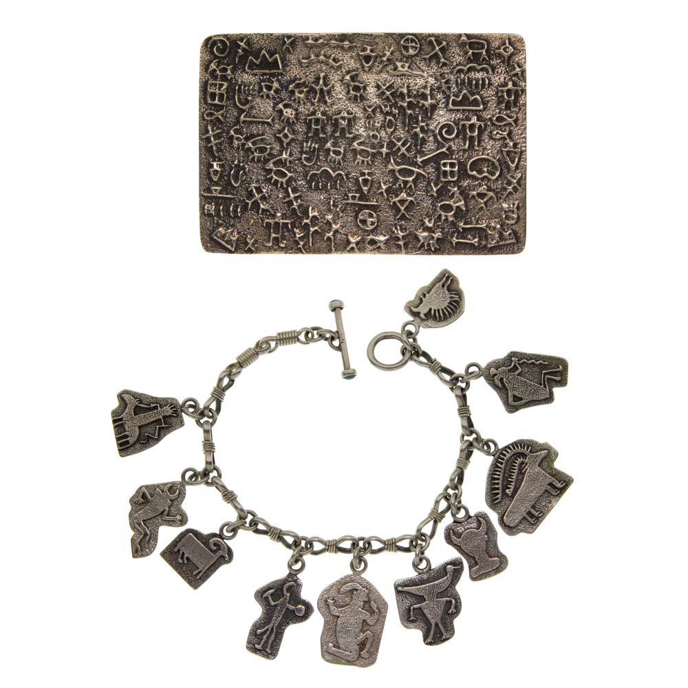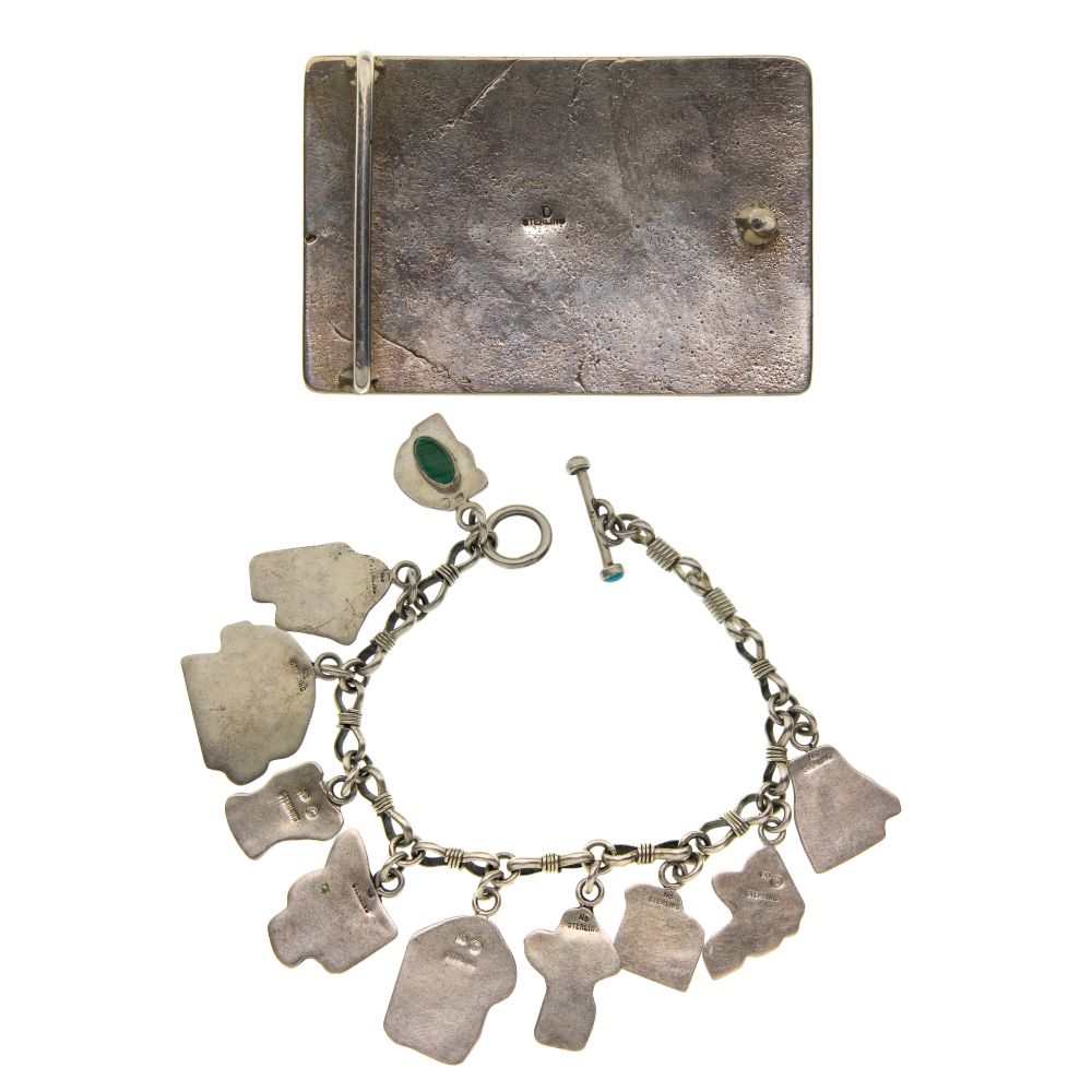 (2) items including a charm bracelet signed “NS” having ten raised figure charms and a belt buckle signed “D” having raised figures of mountains, clouds, corn, deer, people and more (both marked “sterling”)