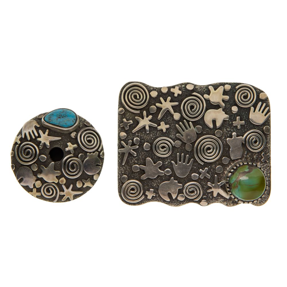 Native American Alex Sanchez Sterling Silver and Turquoise Belt Buckle and Seed Pot