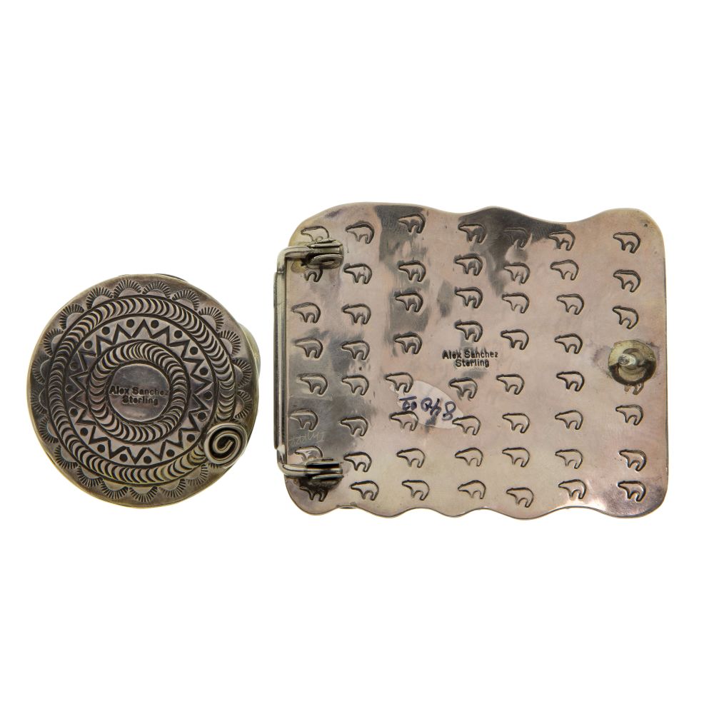 LOT #148 - Native American Alex Sanchez Sterling Silver and Turquoise Belt Buckle and Seed Pot