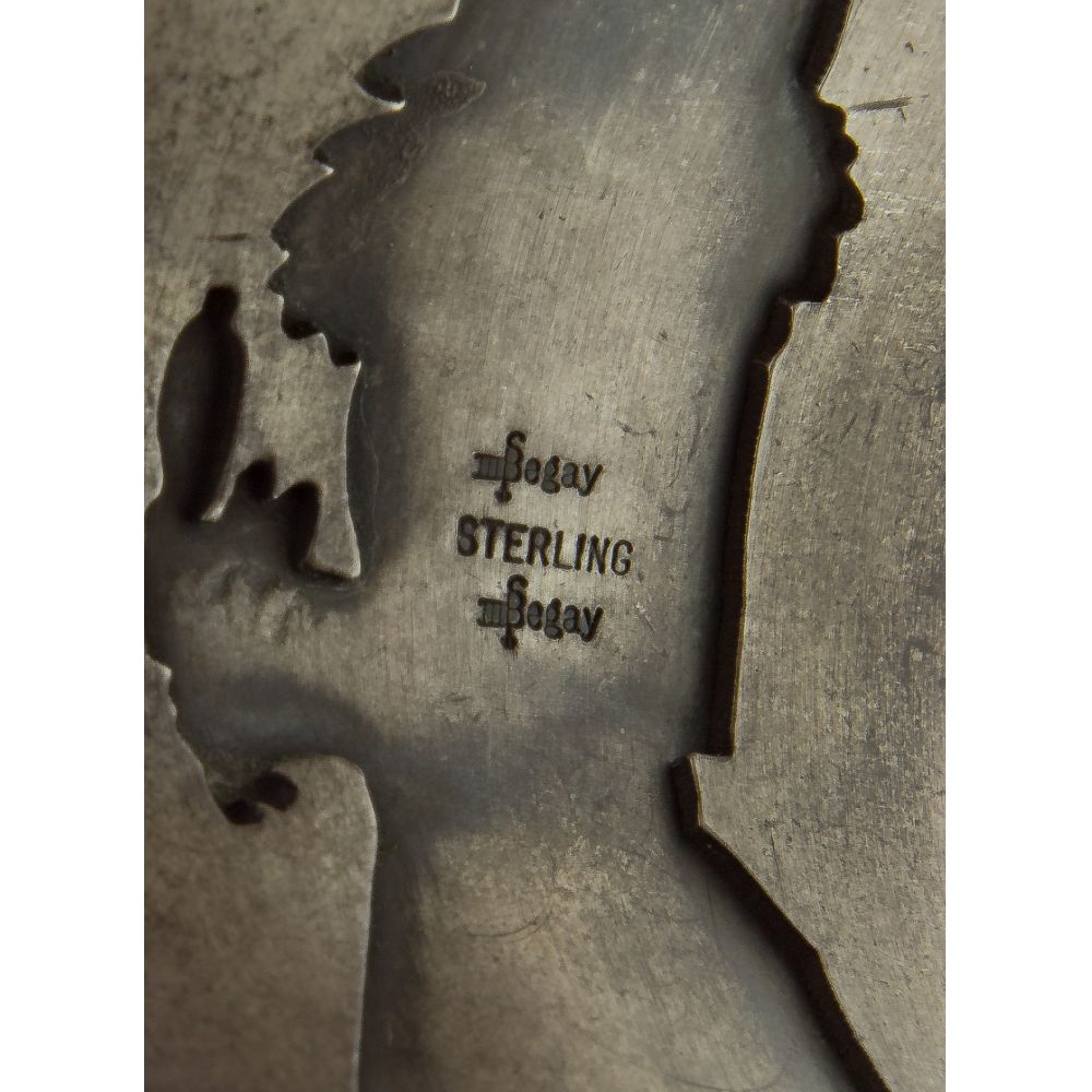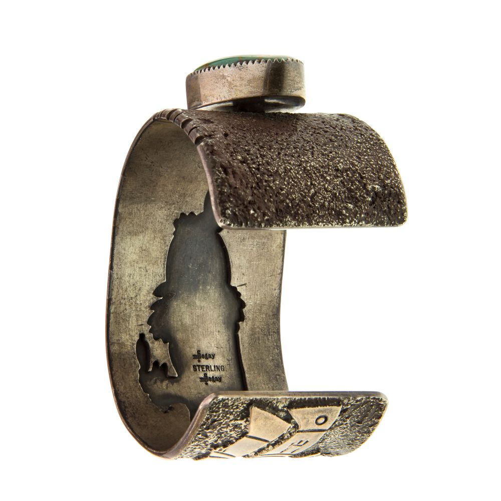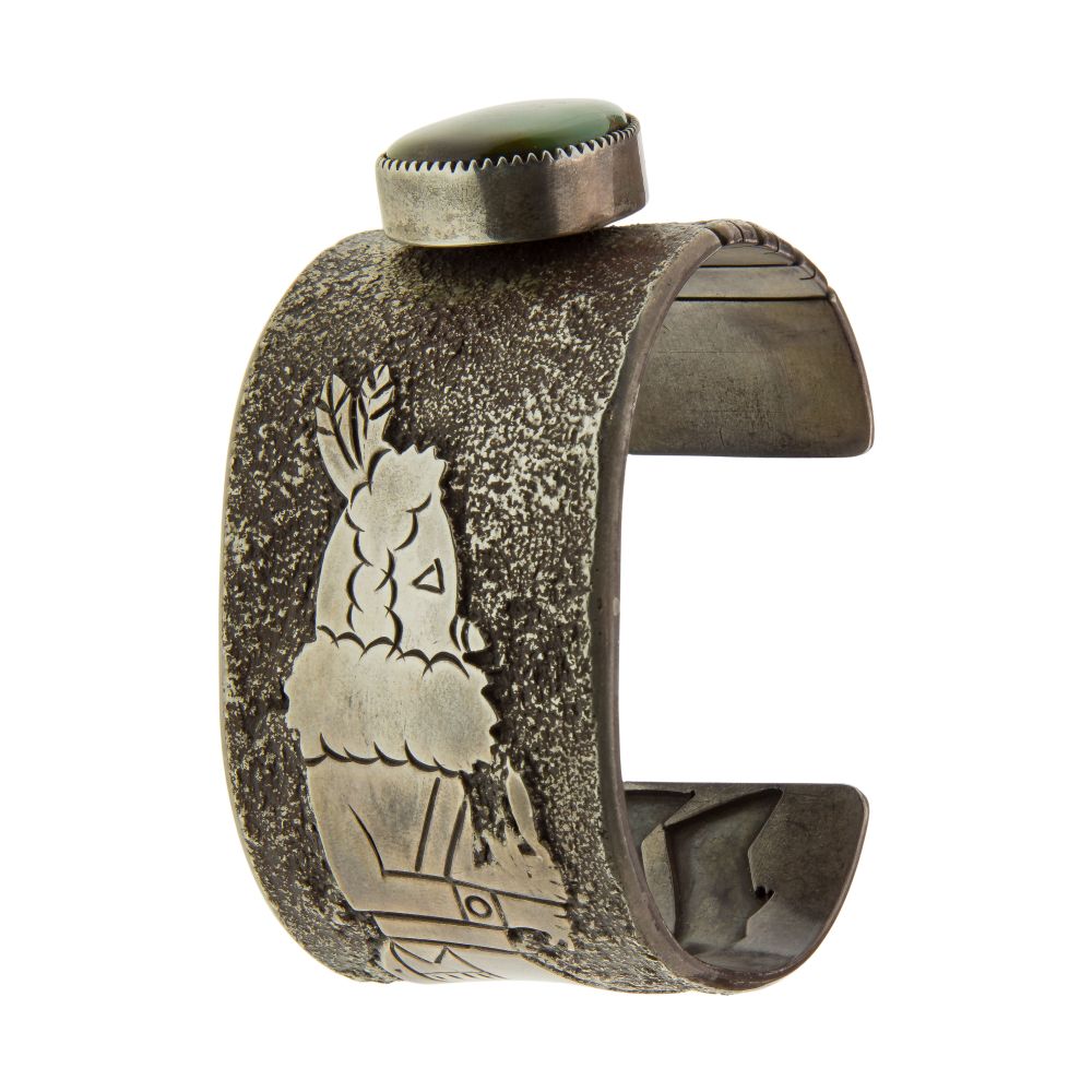 A cuff bracelet signed “msBegay” having a free-form cabochon turquoise and an Native American motif (marked “sterling”)