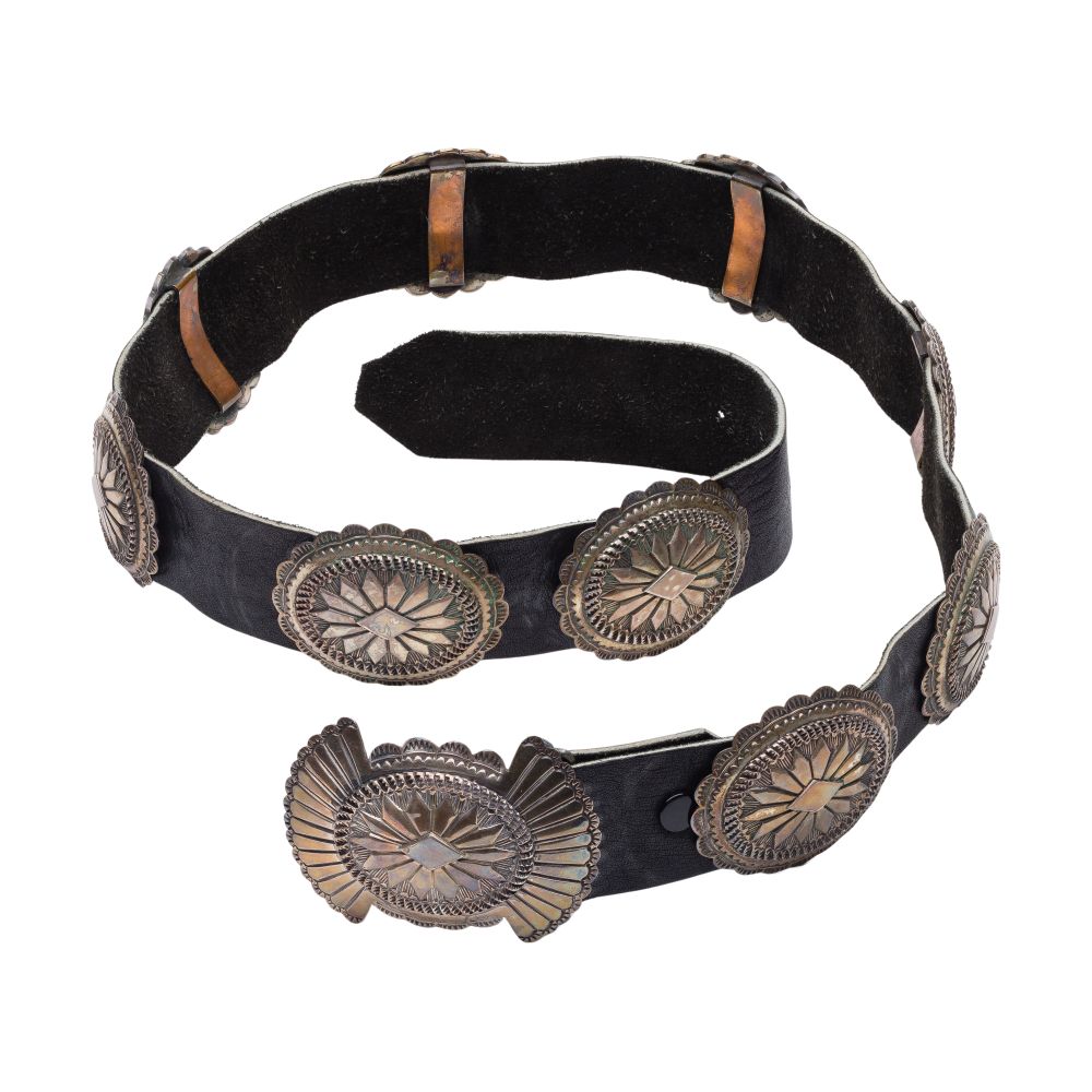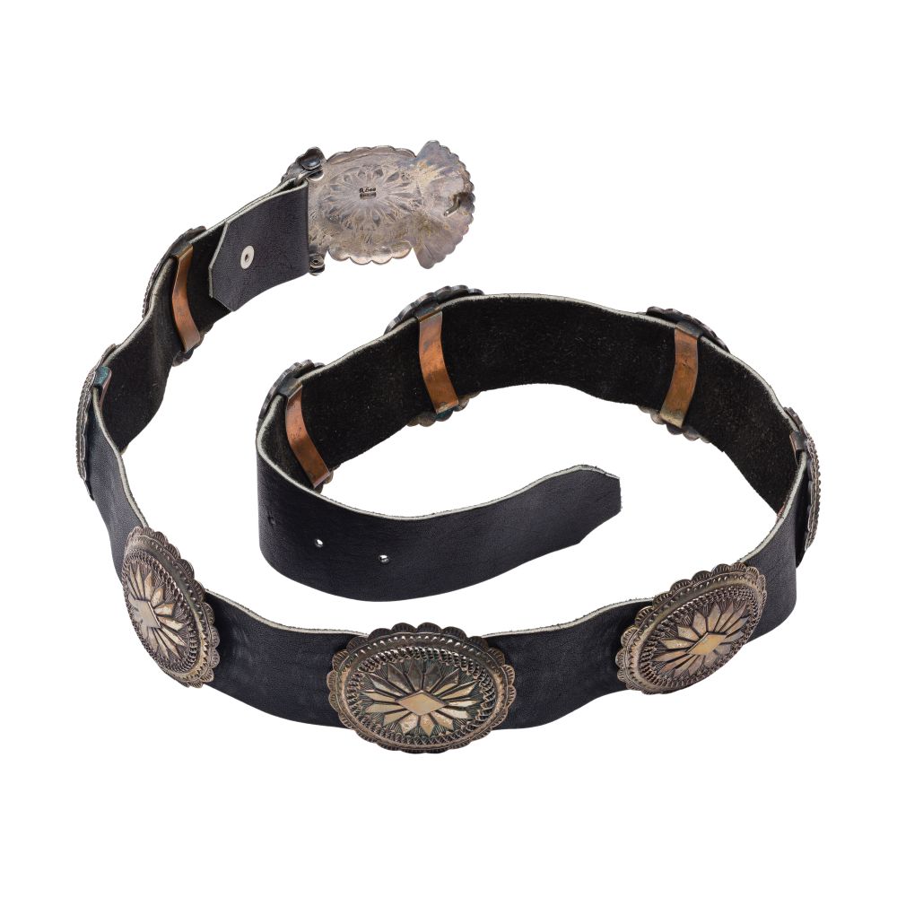 Black leather having a belt buckle and nine conchos with copper back straps (marked “sterling” and “R. Lee” back of belt buckle)