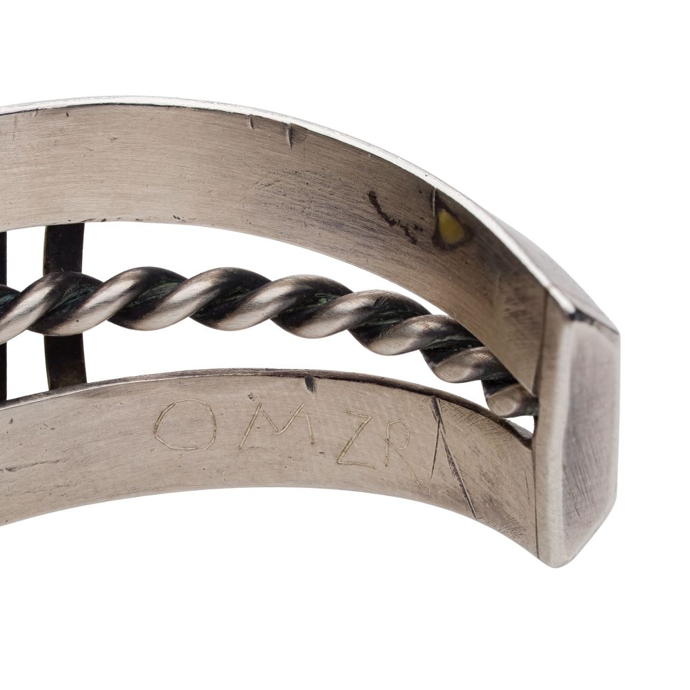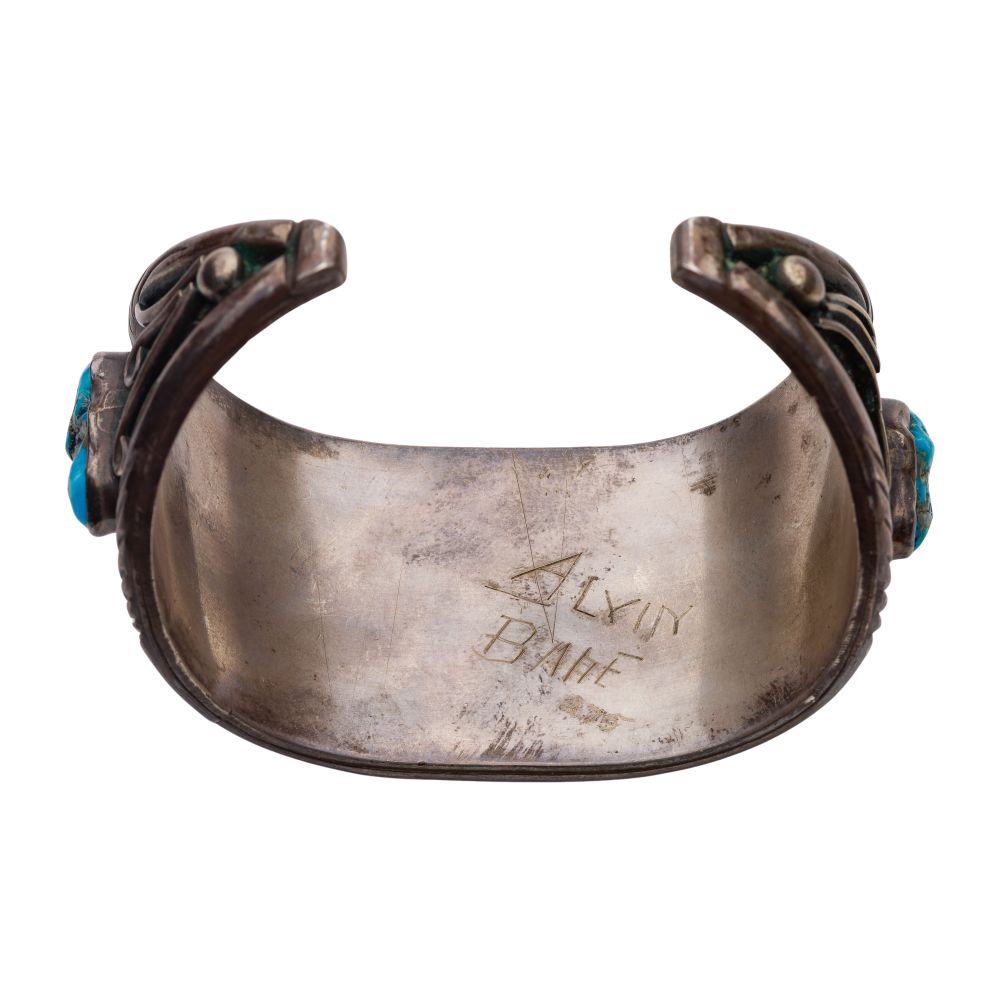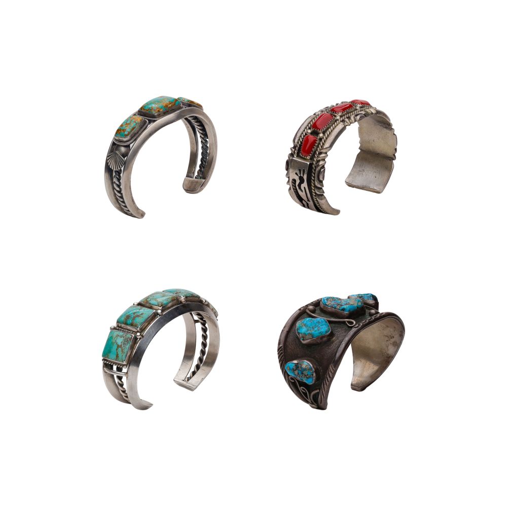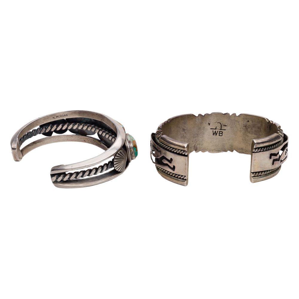 (4) items including a green turquoise by H. Morgan (marked “sterling” and “H. Morgan”), a green turquoise (illegible etch signed), a blue turquoise by Alvin Bahe (etch signed) and a coral by Wilson Begay (marked “WB”)