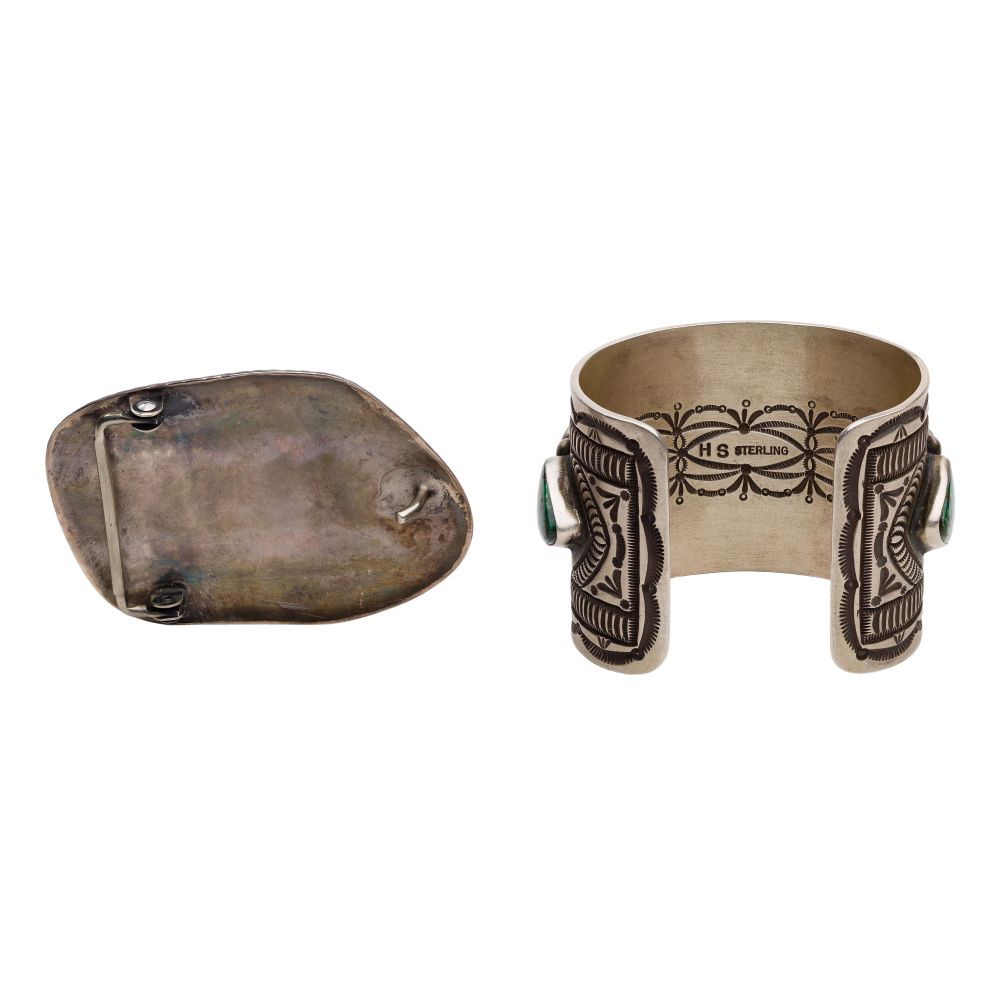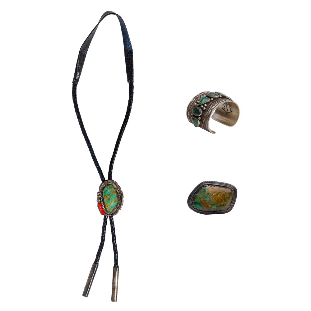 (3) items including a cuff bracelet having green cabochon turquoise by Herman Smith (marked “sterling” and “HS”), a belt buckle having a 40 x 60mm green cabochon turquoise and a bolo tie having a sterling silver slide with a 48 x 27mm green cabochon flanked by a coral