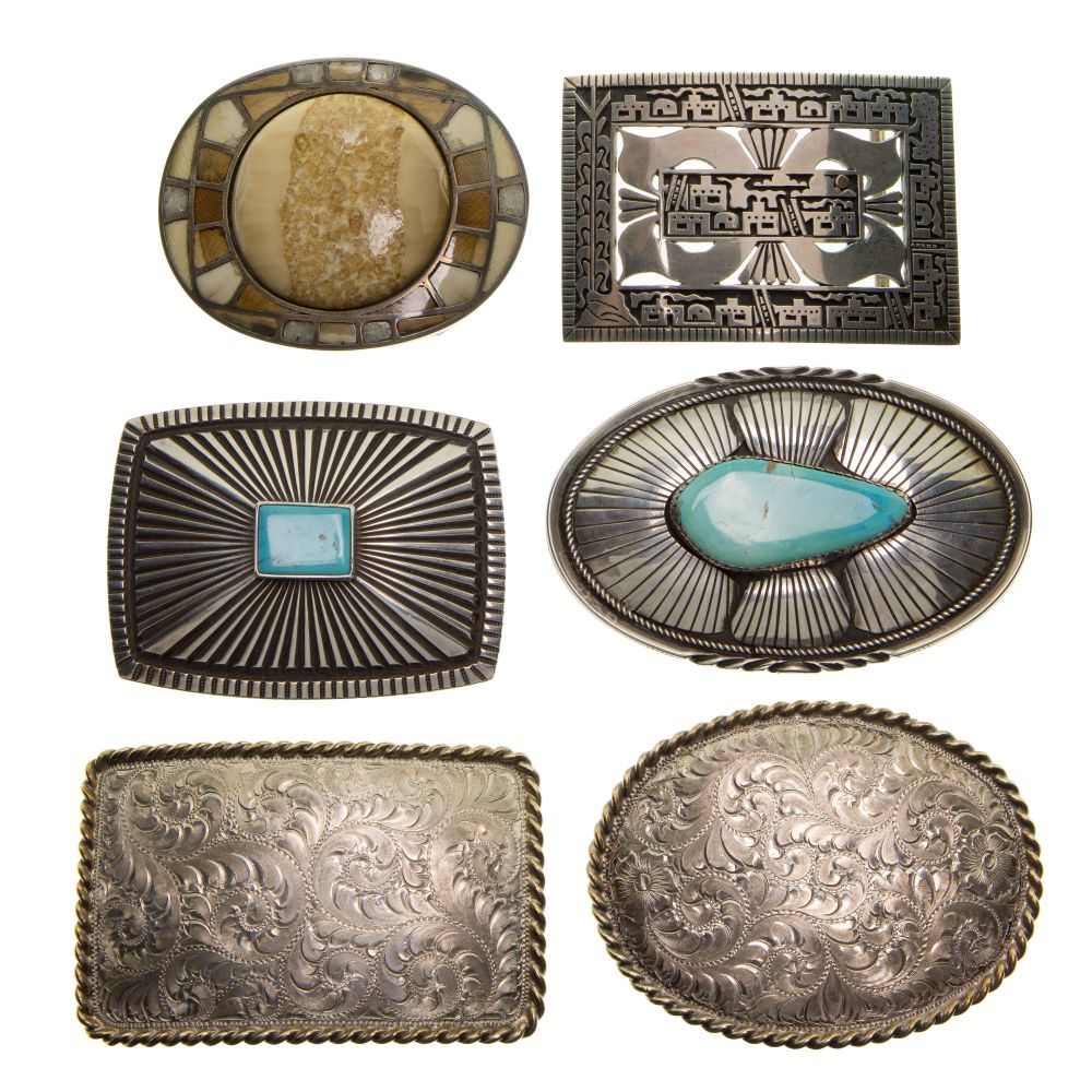 (6) total items including an openwork buckle by Joseph De Vern Coriz, a brown polished agate by “WB” and (2) having blue turquoise; together with (2) belt buckles by Treasure Reno Chest (most items marked “sterling”)