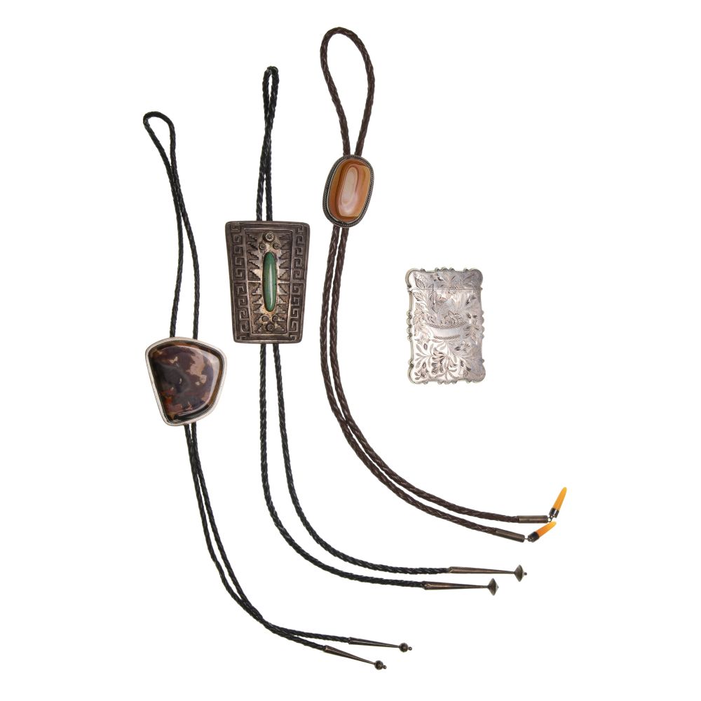 Condition: light wear on all, top of match holder detached, two bolo ties and match holder unmarked but XRF tested as 0.925 silver, light wear on all, top of match holder detached, two bolo ties and match holder unmarked but XRF tested as 0.925 silver