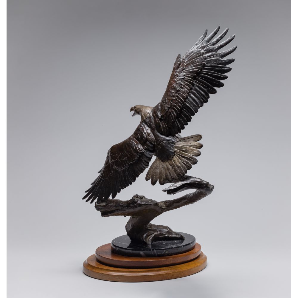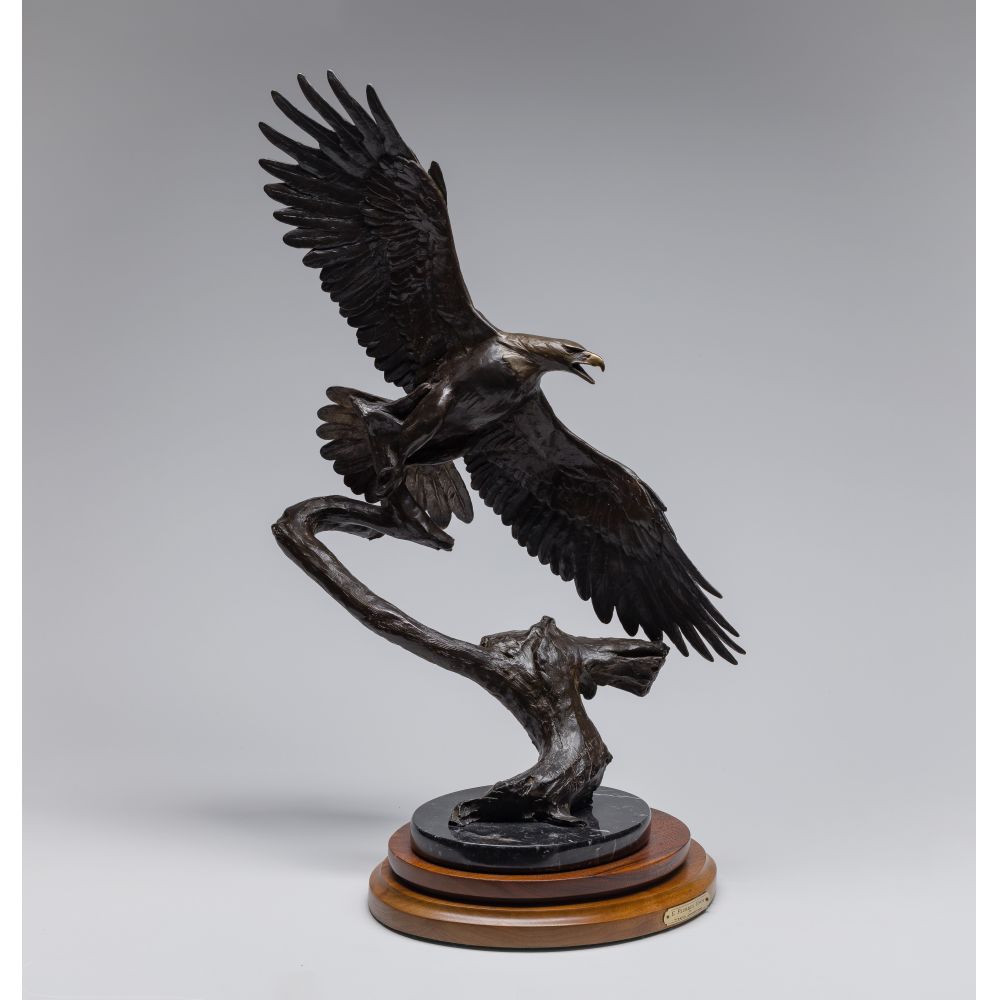 1989, cast signed, #22/35, depiction of a bald eagle taking flight from its perch, on a stone base attached to a wood base having placard