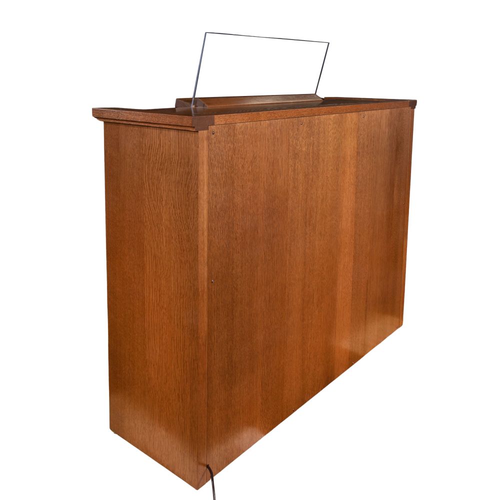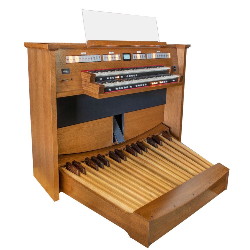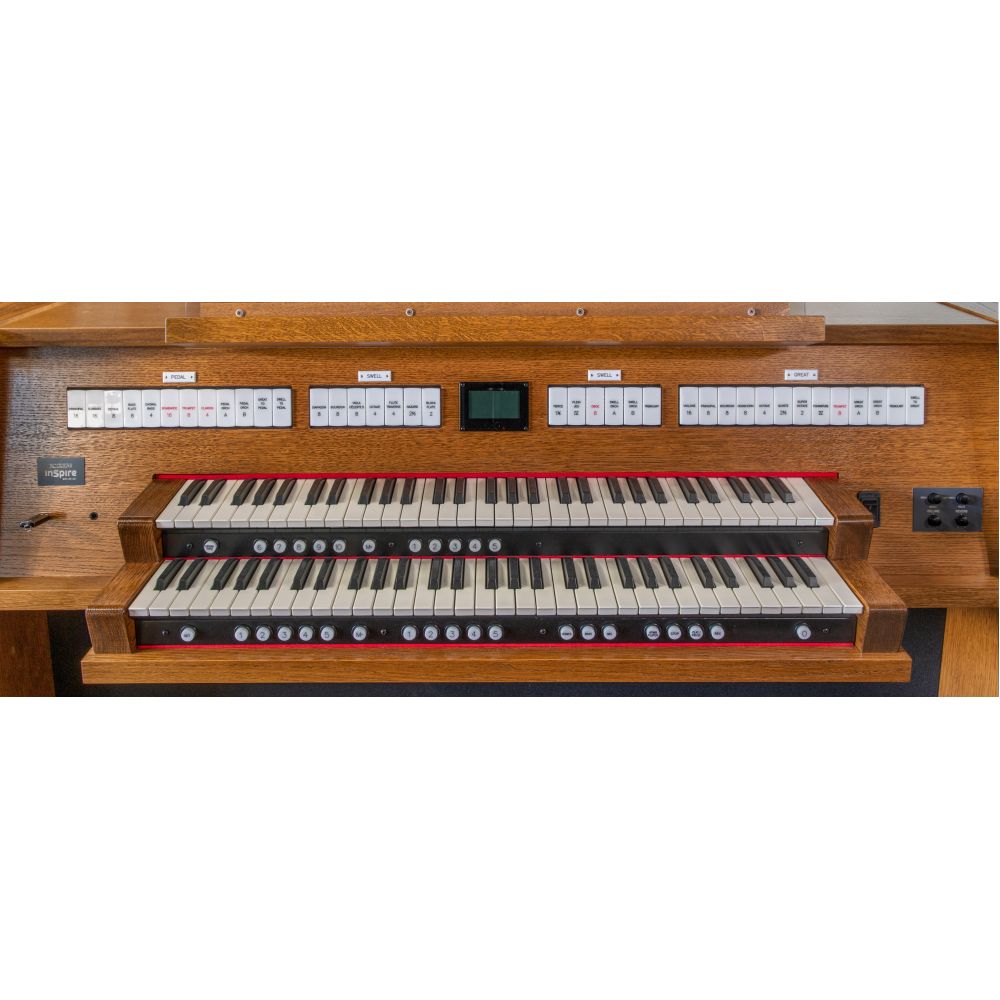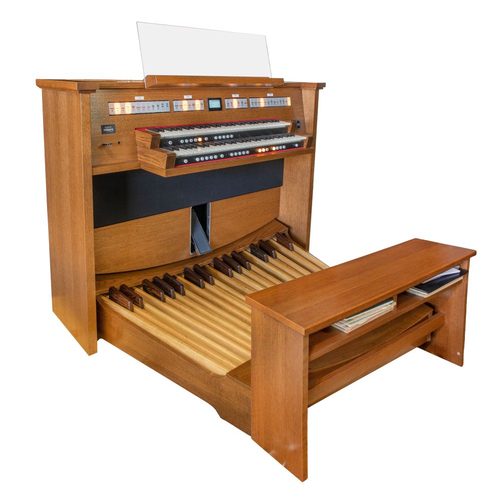 Having 27 stops with a total of 153 voices, 4 unique organ styles, a Variant Library, voice palette, 135 pipe organ voices, 18 orchestral voices such as piano, harpsichord, harp, strings, trumpet, clarinet, 32-note AGO pedal-board, 3 couplers, 6 orchestral couplers, a memory system, audio system and matching bench both in a medium oak finish