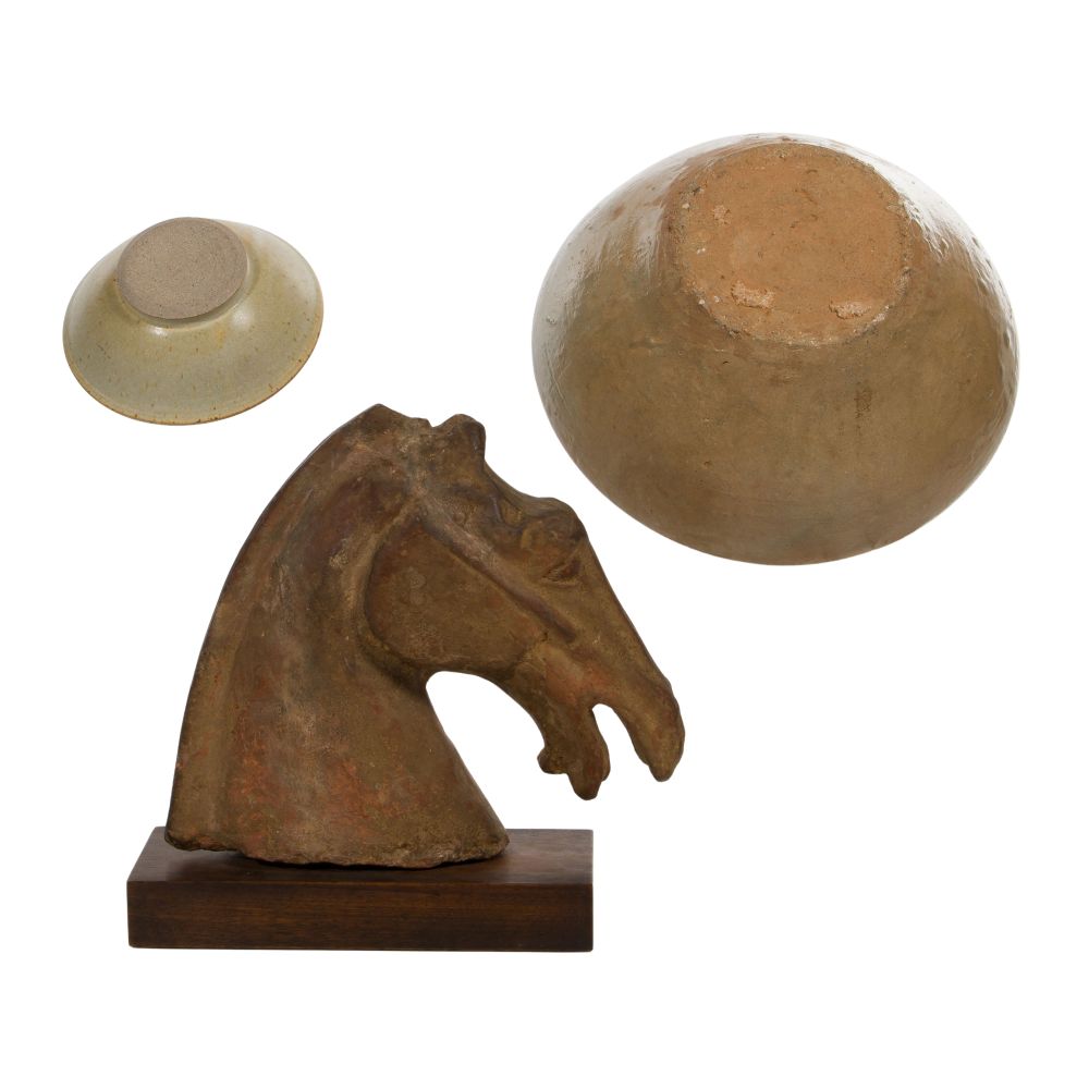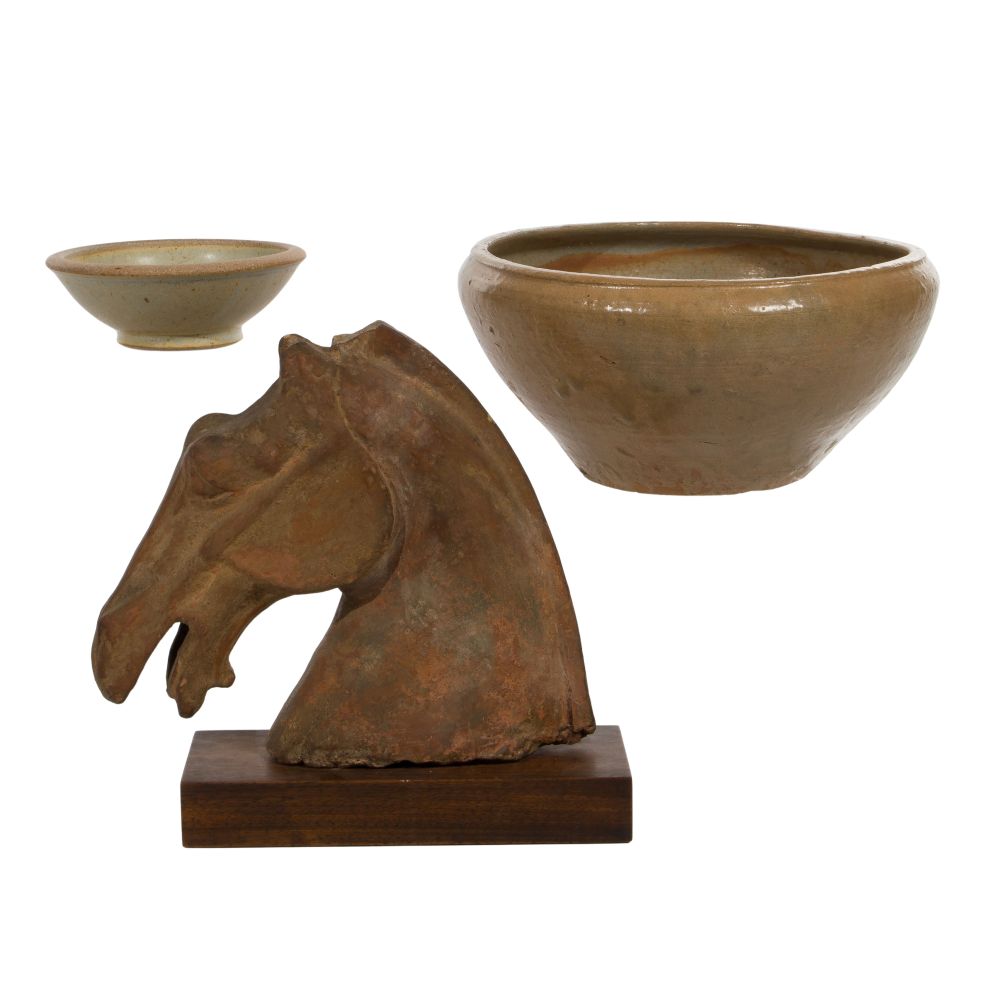 (3) items including (2) celadon glazed bowls and a horse head on wood base