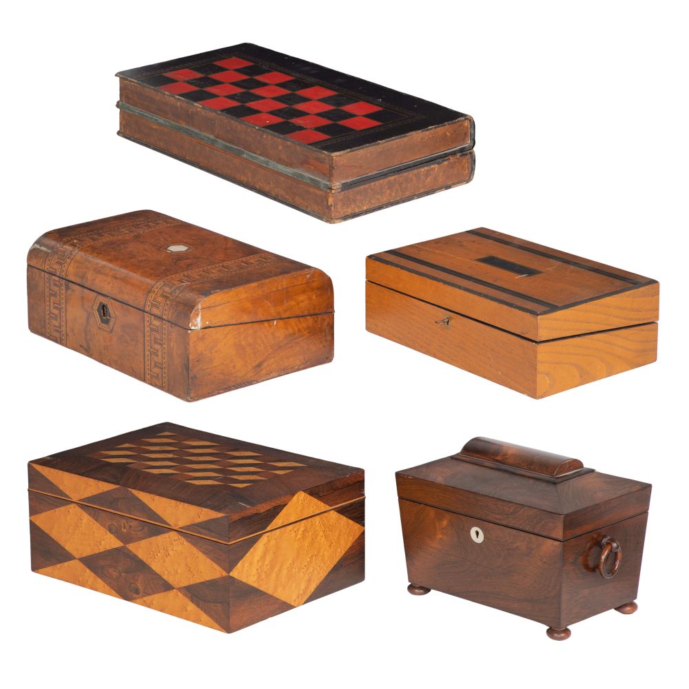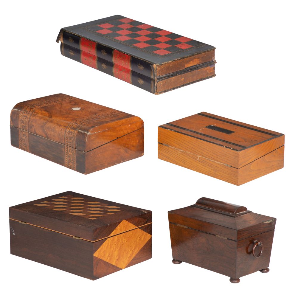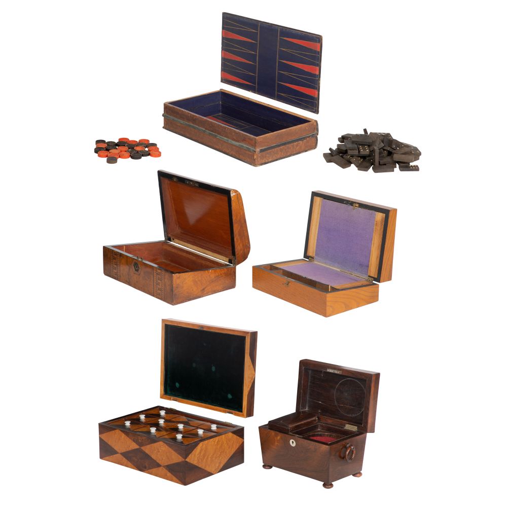 Condition: overall light to moderate wear consistent with use, sewing box having detached lid (retaining hinges) having two chips to veneer, interior long compartment lid unsupported at an end (detached support piece inside), no key, tea caddy having loss to veneer on lid left edge, lacking interior round canister and key, inlaid mahogany lap desk lacking all interior fittings and having splits to veneer on lid, a spot of lifting, lacking inlaid mother of pearl key hole plate and key, game box cover detached, overall light to moderate wear consistent with use, sewing box having detached lid (retaining hinges) having two chips to veneer, interior long compartment lid unsupported at an end (detached support piece inside), no key, tea caddy having loss to veneer on lid left edge, lacking interior round canister and key, inlaid mahogany lap desk lacking all interior fittings and having splits to veneer on lid, a spot of lifting, lacking inlaid mother of pearl key hole plate and key, game box cover detached