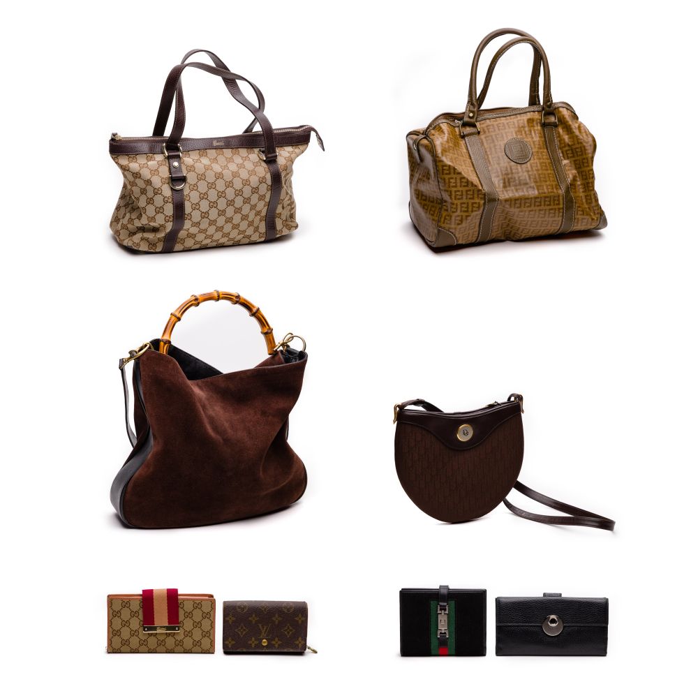 (8) items including Louis Vuitton Monogram wallet, a Gucci Abbey tote, Gucci Bamboo handle suede, Gucci Signature wallet, a Gucci Jackie wallet, Gucci Eclipse wallet, a Fendi Zucca Boston tote and a Christian Dior cross-body