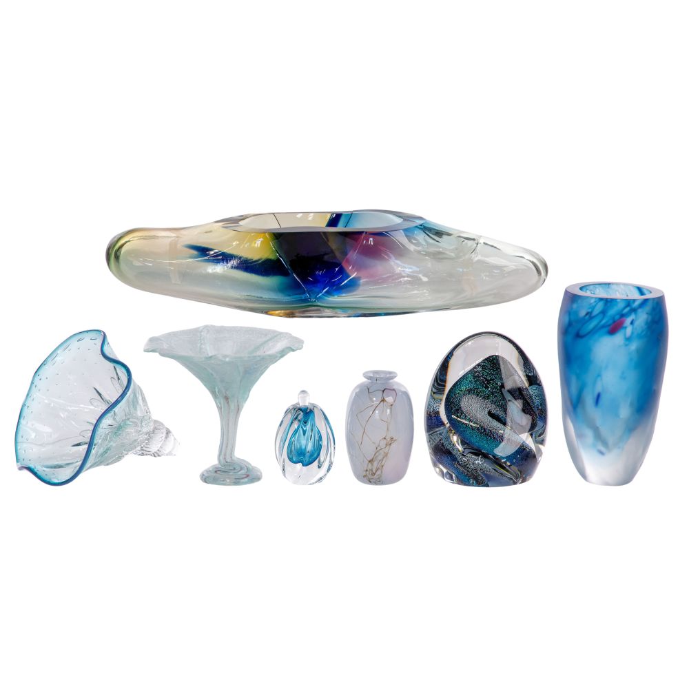 (7) handblown vases, bottles and bowls in various shapes and sizes from artists including Adam Aaronson, Rollin Karg, J. Bell and Josh Simpson
