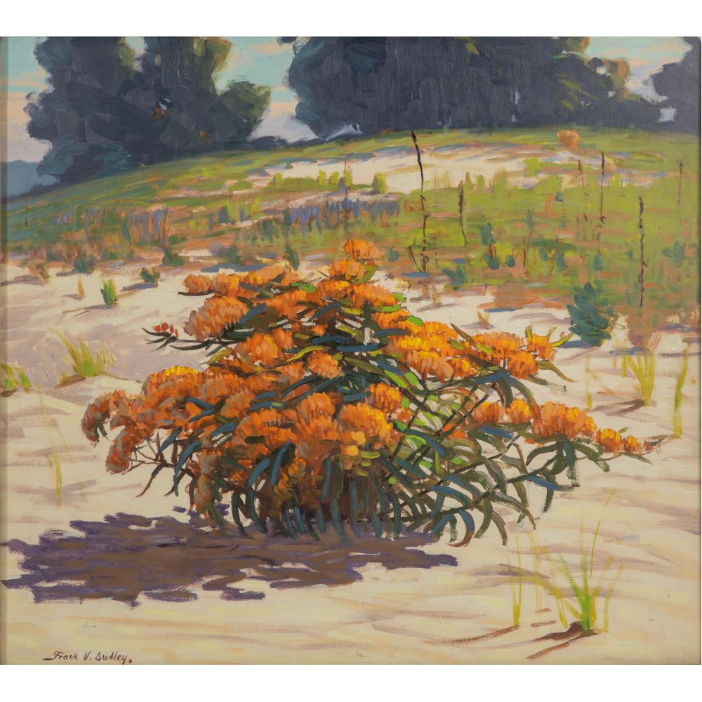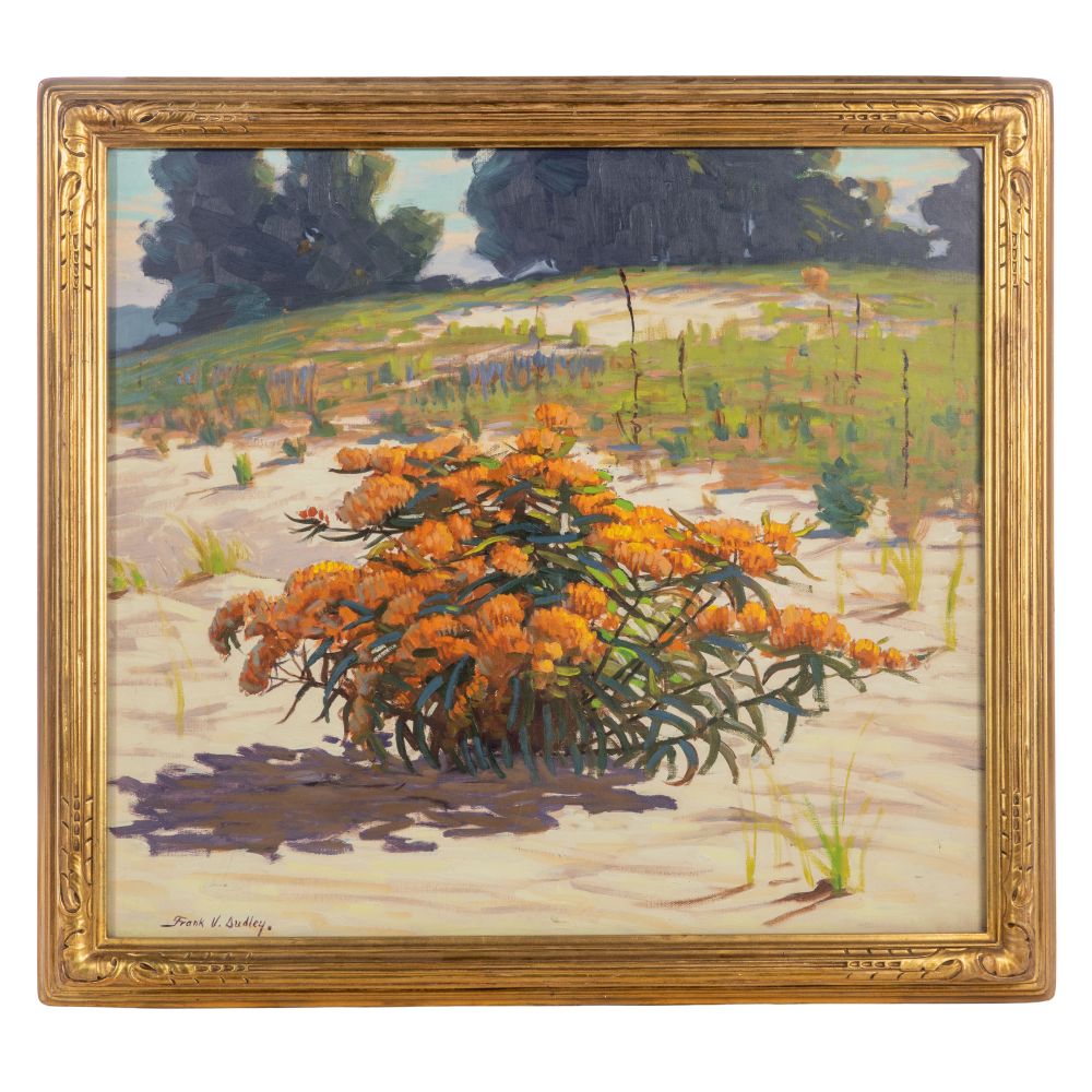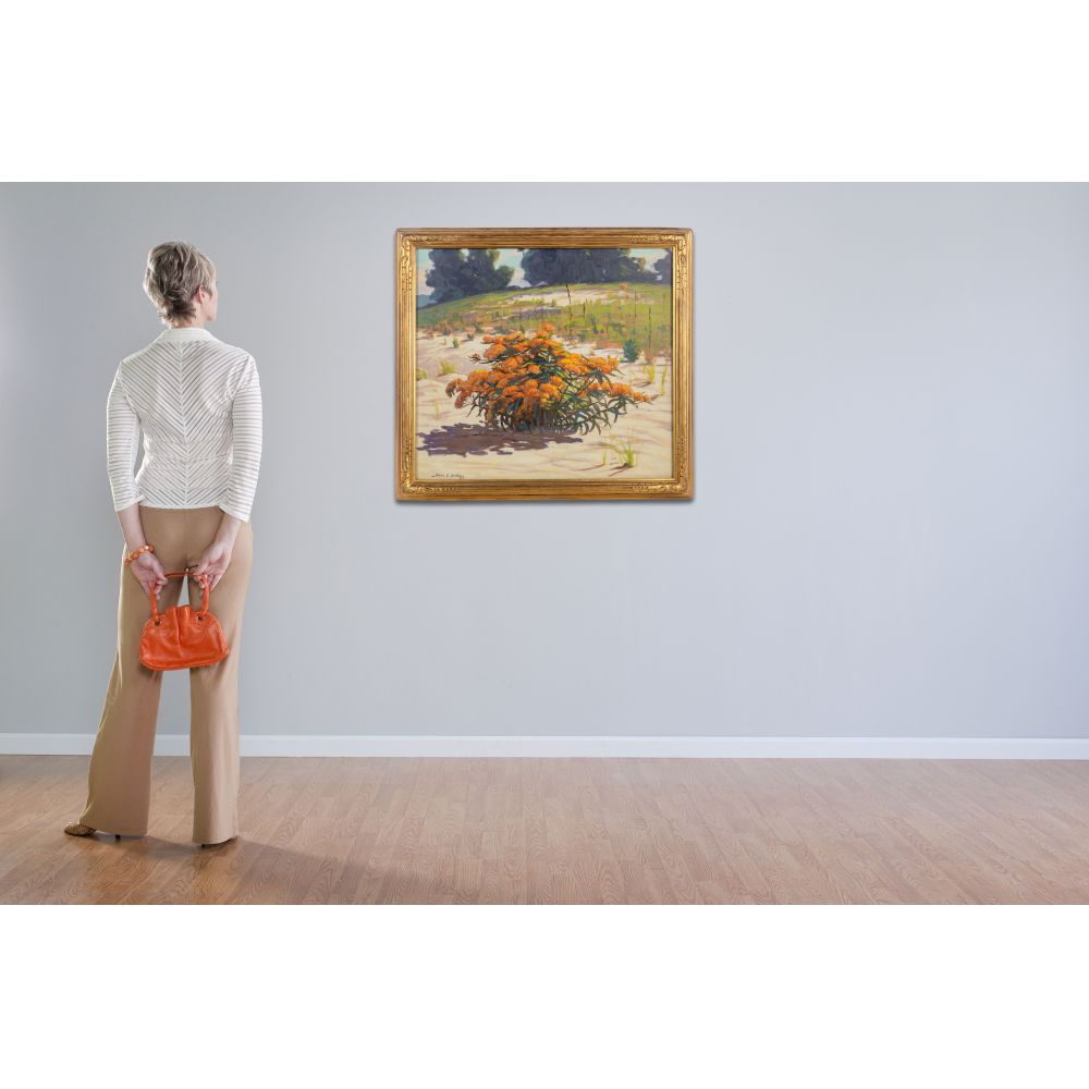 Undated, signed, depicting a clump of butterfly weed in the dunes of Lake Michigan, behind glass in a gold-tone gesso on carved wood frame, retaining a Marshall Field and Company label verso