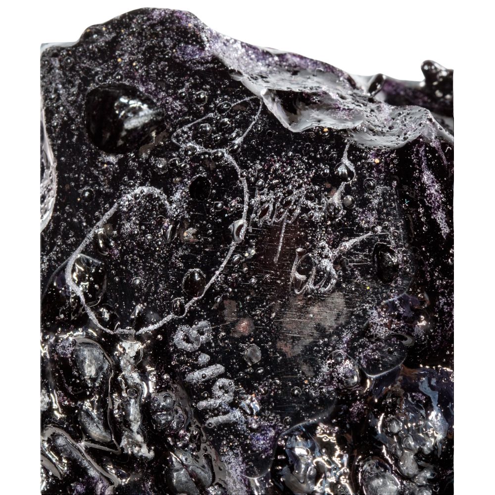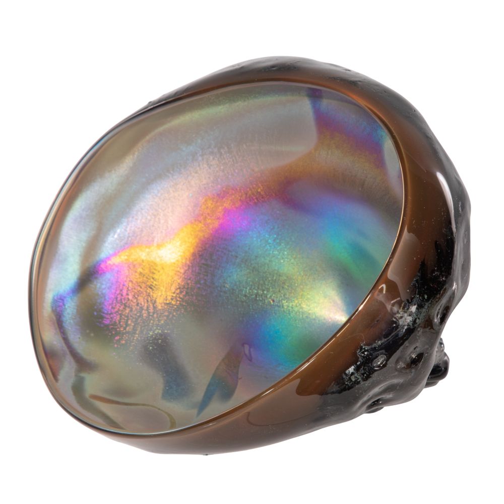 A hand-blown meteorite style sculpture with an iridescent bowl-like interior, signed on underside