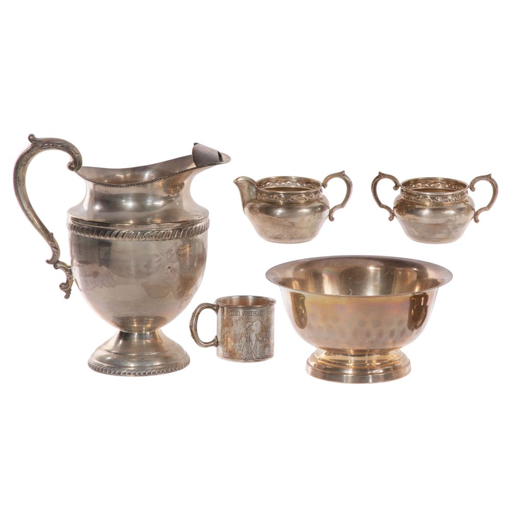 (5) items including a sugar and creamer by Reed & Barton, a water pitcher by Poole, a Paul Revere reproduction bowl by Poole and a Noah’s ark engraved baby cup by Webster (all marked “sterling”)