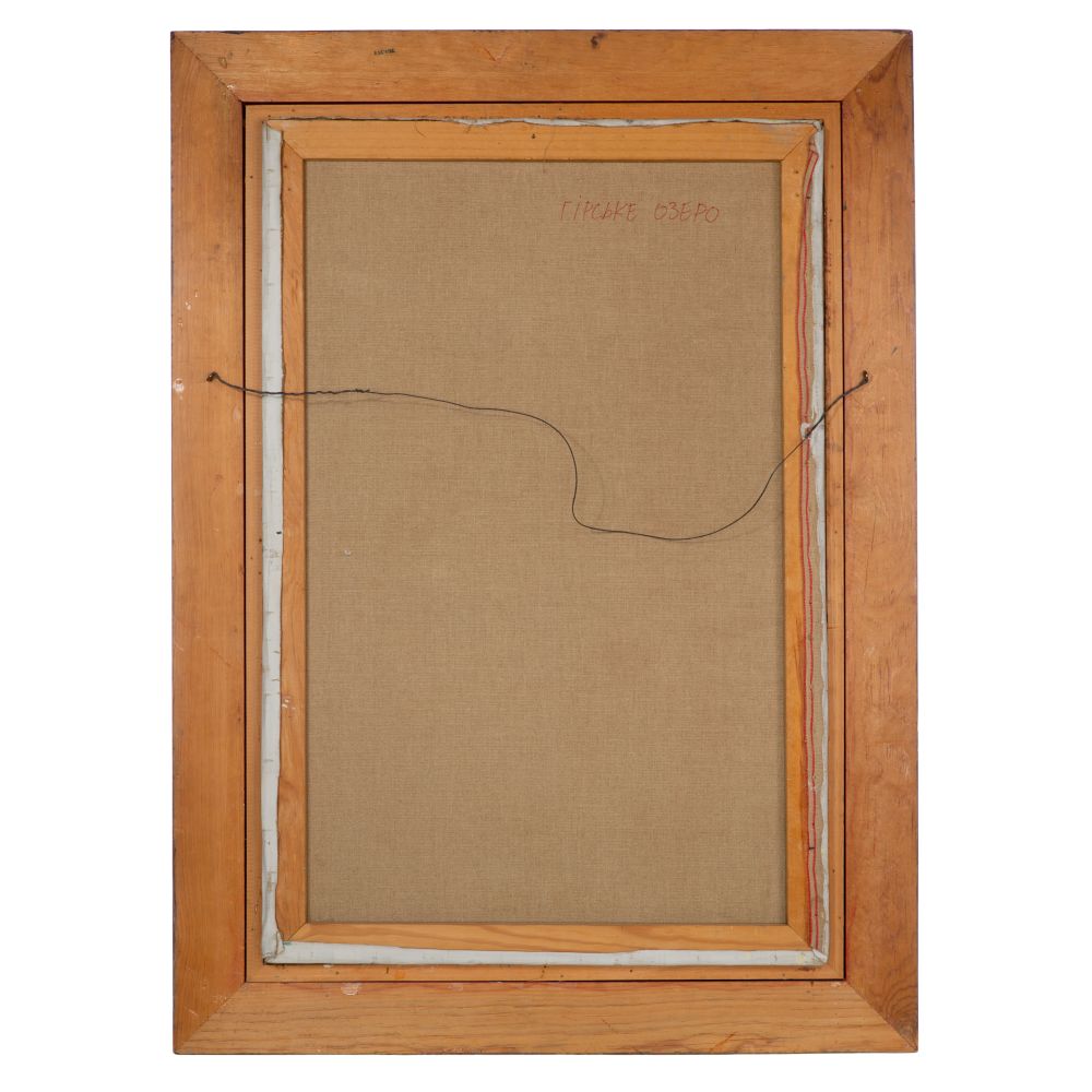 Undated, unsigned, titled verso, depicting a landscape of mountains, forest and water, in a wood frame