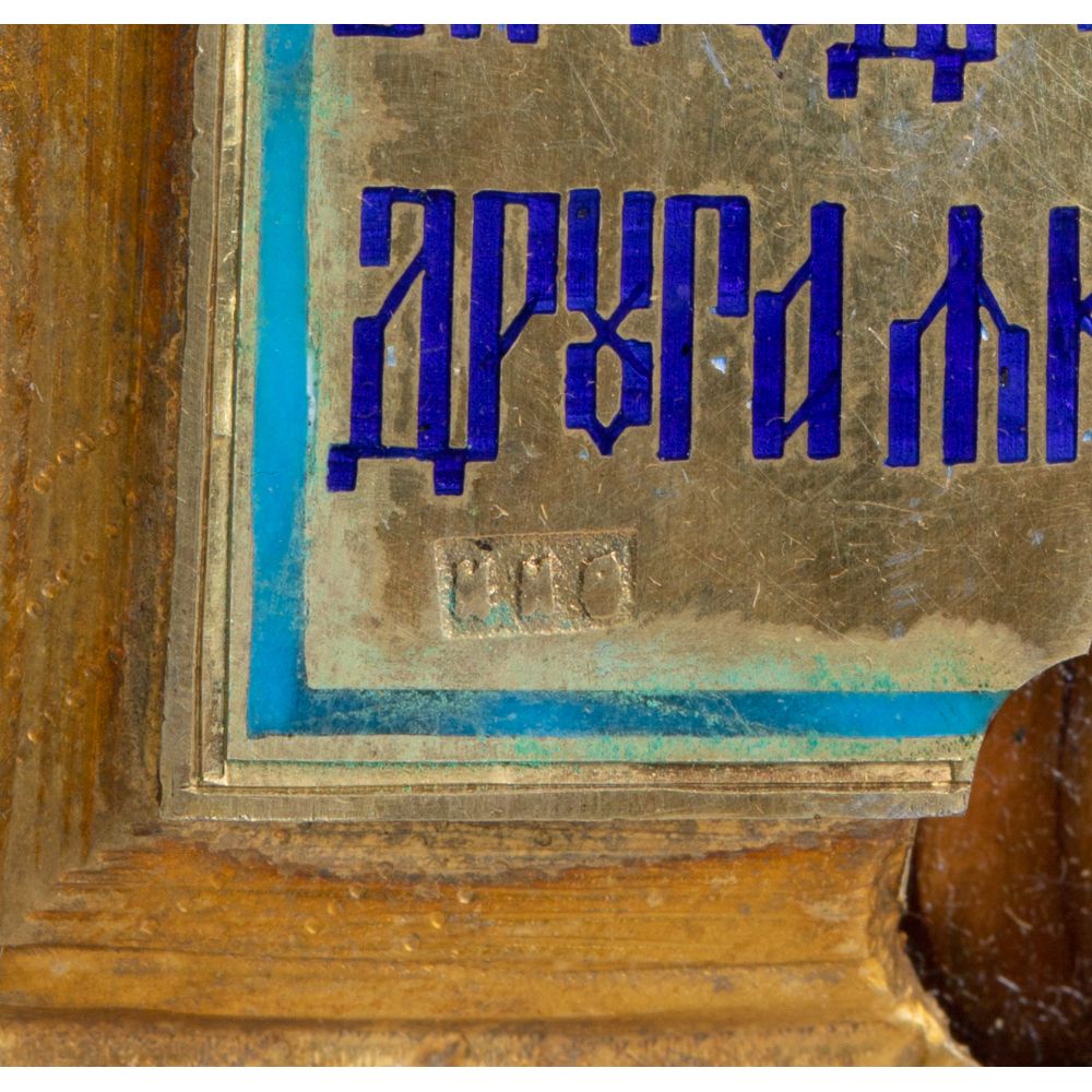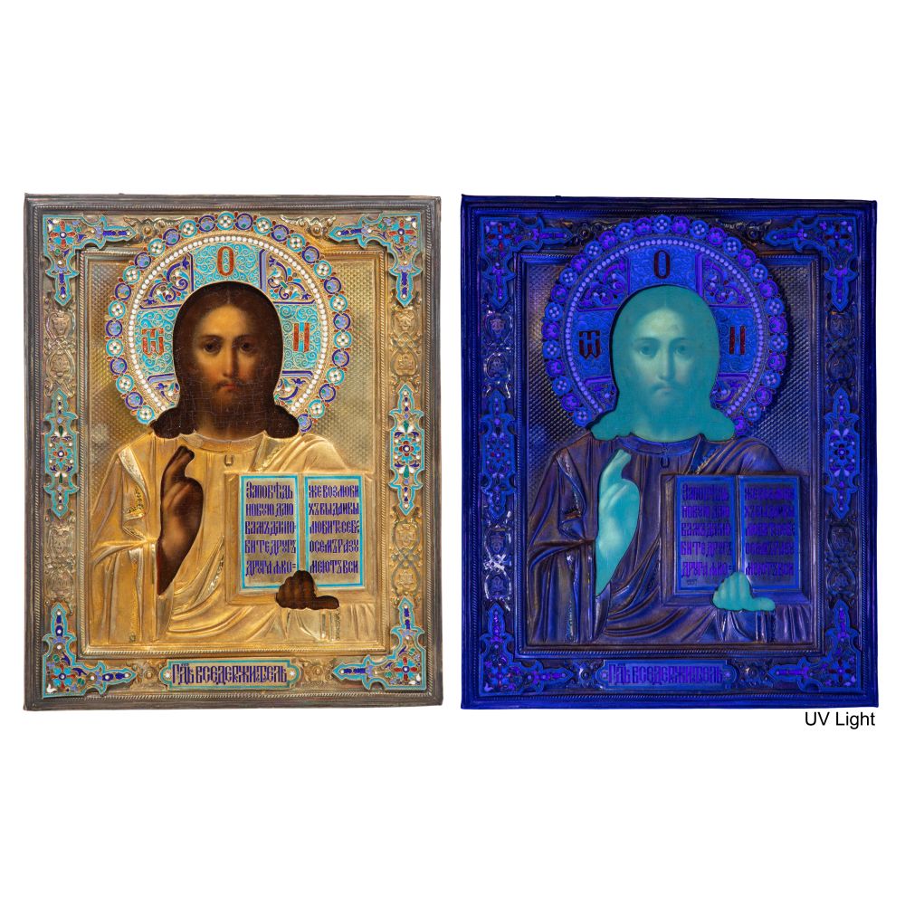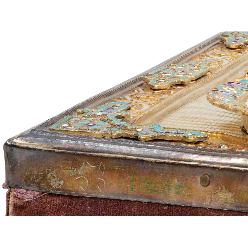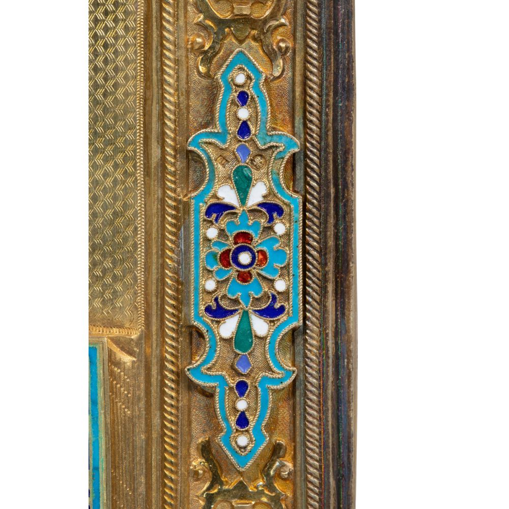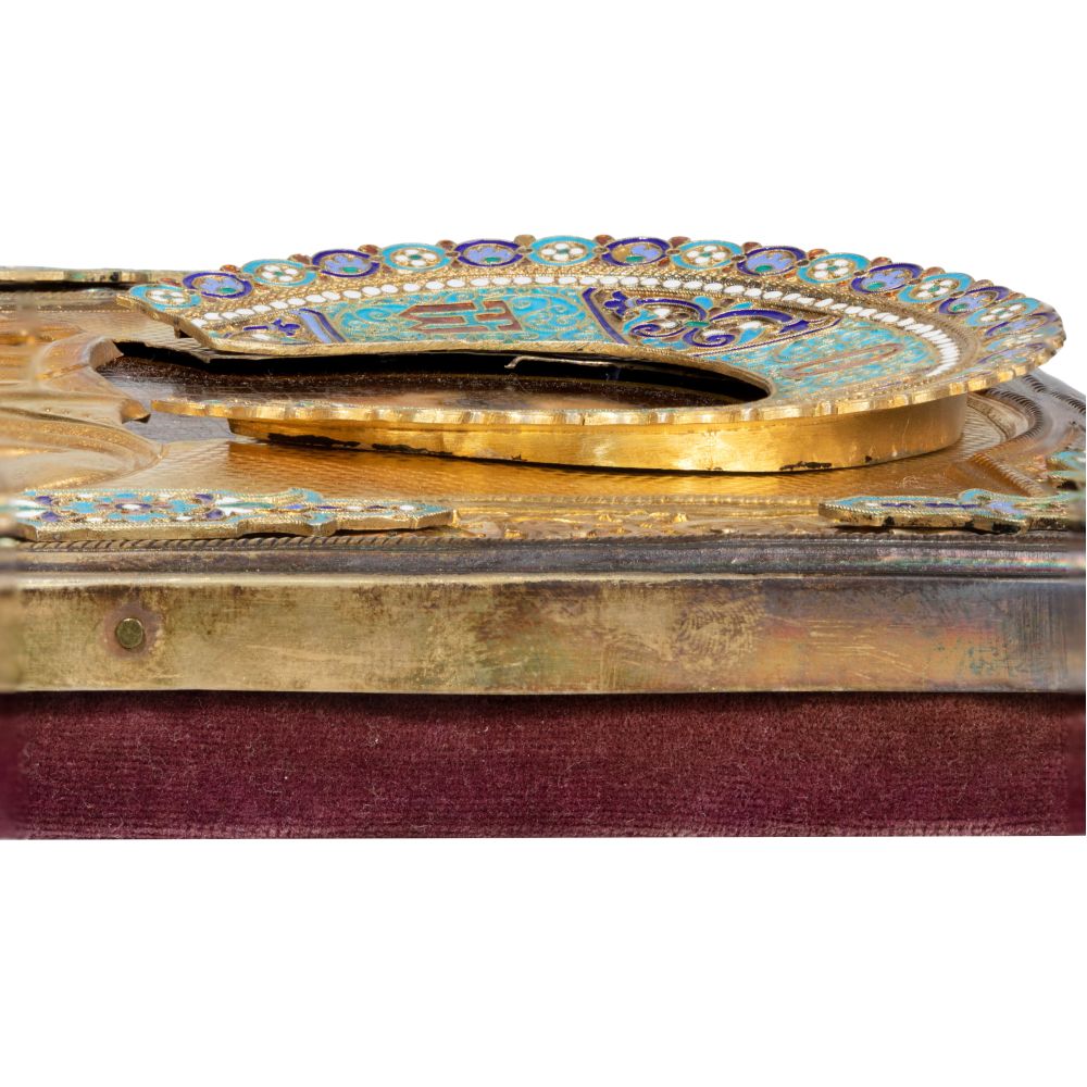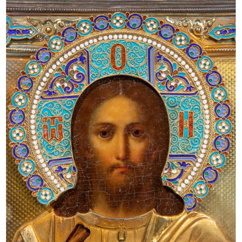 A hand painted icon of Christ the Pantocrator having cloisonne and champleve enamel and gilt silver, Lev Fridrikhovitch Oleks assay mark and unidentified maker in a fitted wood presentation box