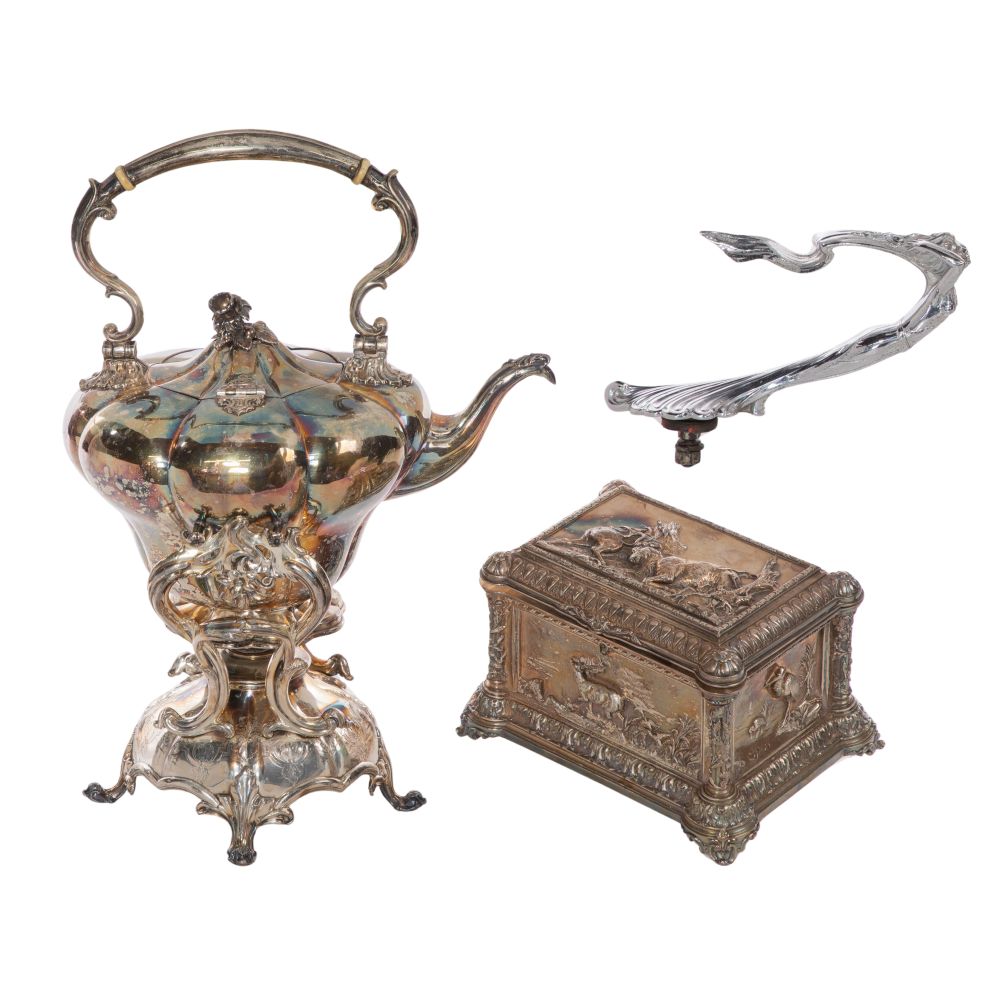 (3) total items including a hot water kettle on stand and a lidded box; together with a chrome car hood ornament
