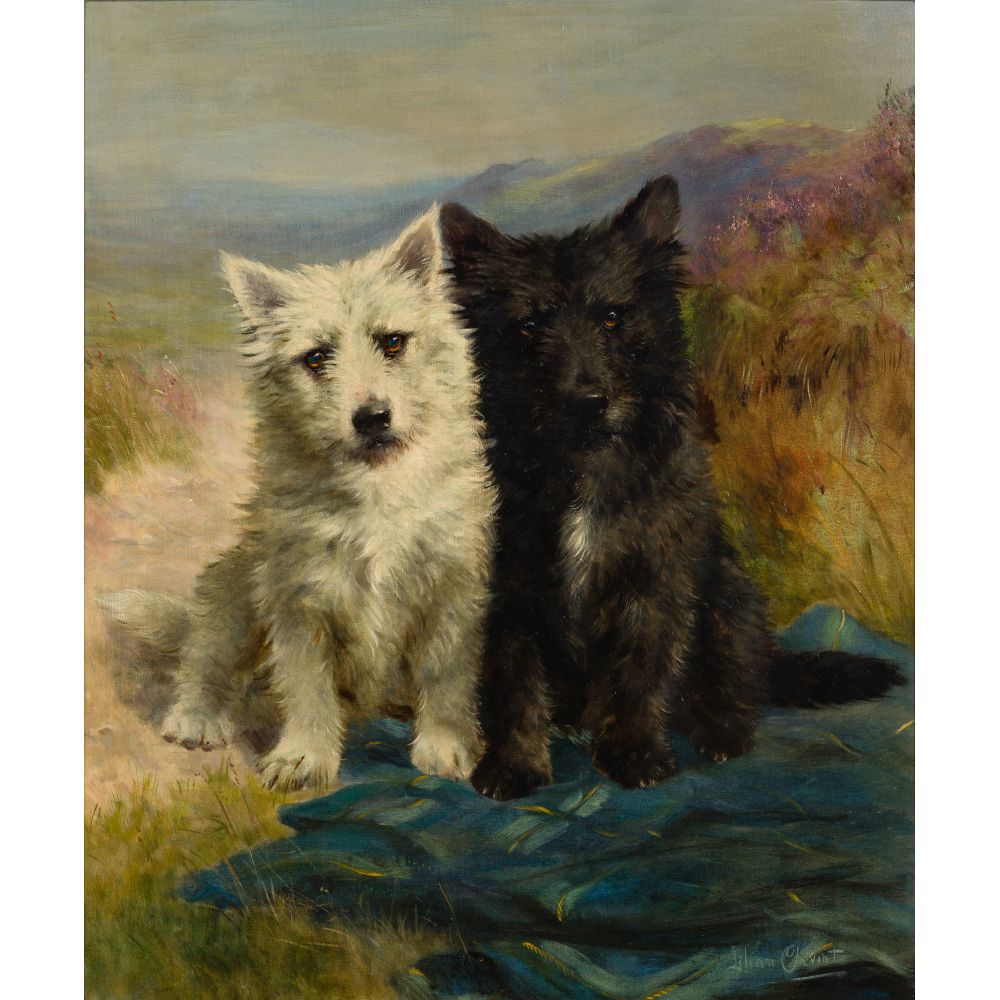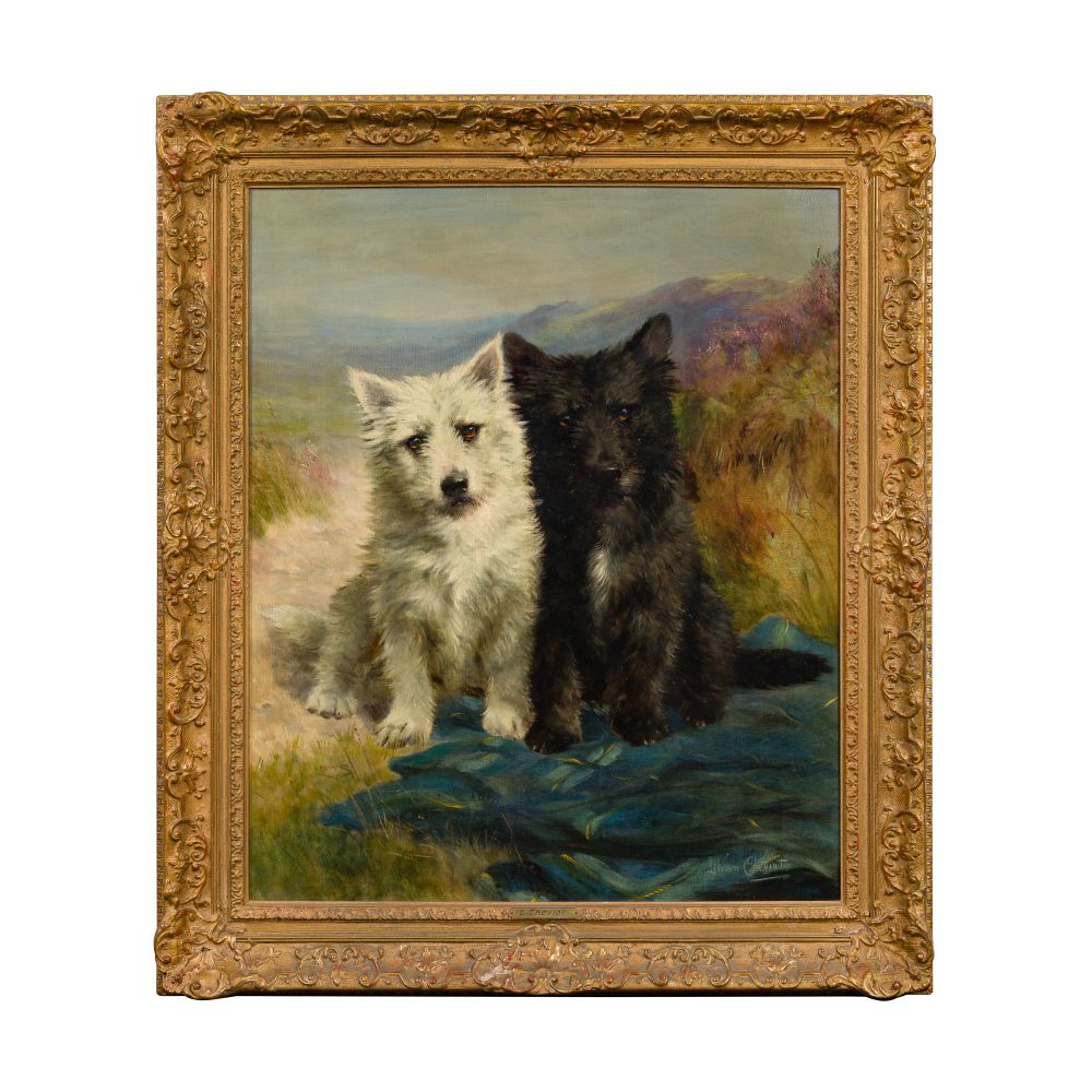 Undated, signed, depicting two terriers in a field, in gilt and wood frame having name placard