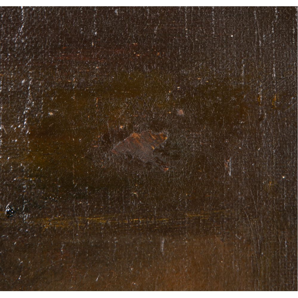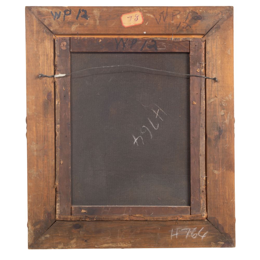Condition: craquelure overall, re-stretched over hardboard, repaired holes, in-painting, wear from frame friction at edges, wear-through of fold-over canvas verso, frame having moderate wear, craquelure overall, re-stretched over hardboard, repaired holes, in-painting, wear from frame friction at edges, wear-through of fold-over canvas verso, frame having moderate wear
