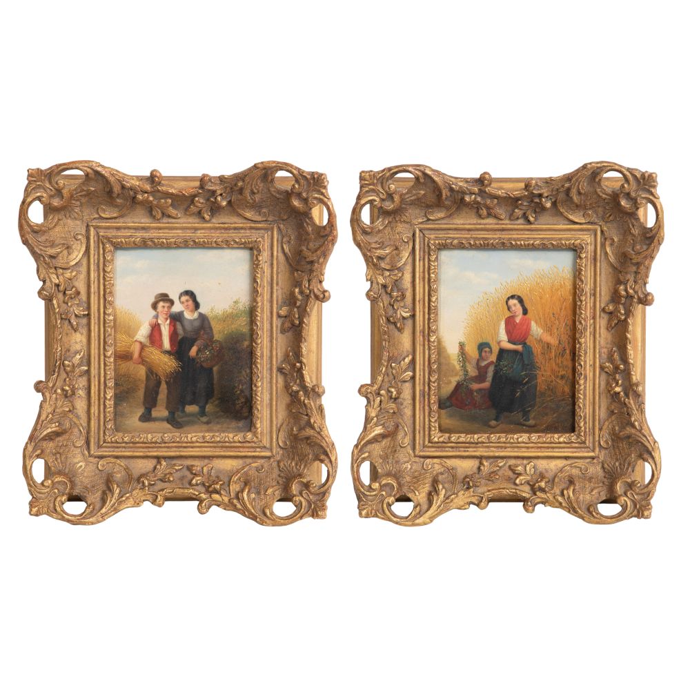 Pair of oils depicting figures at harvest time, uniformly framed in gold-tone gesso on carved wood frames