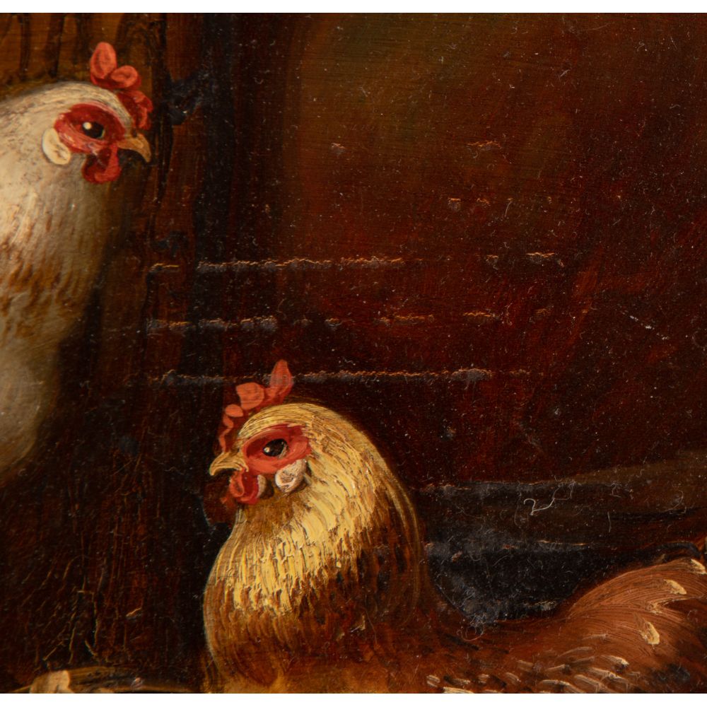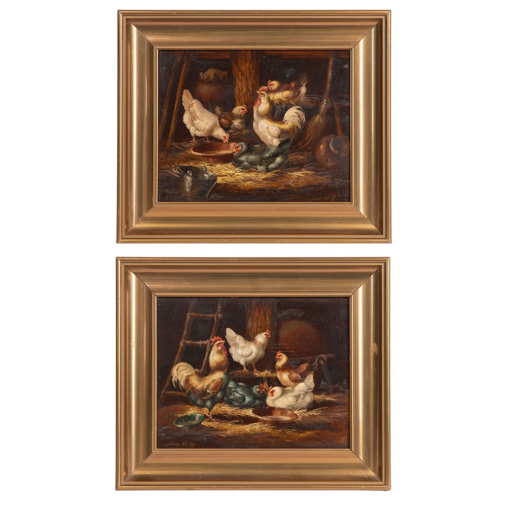 (2) undated, signed oils depicting chickens in the farmyard, in gold-tone painted frames