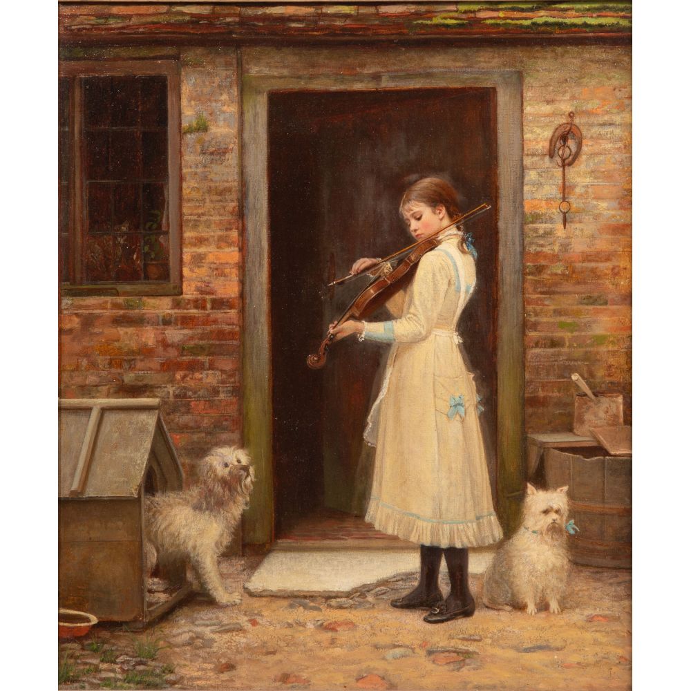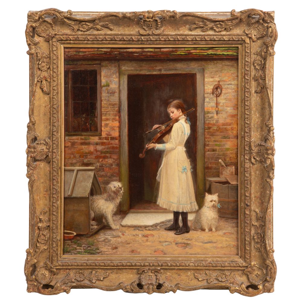 Undated, initial signed on dog dish, depicting a young girl serenading her pets with a violin, in a gold-tone gesso on wood frame, retaining Marshall Field label and attribution verso