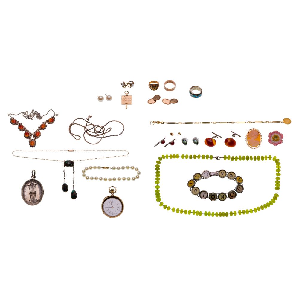 Condition: overall light to moderate wear from use, some tarnish, pearl earrings missing backers, some unmarked but XRF tested as 14k / 10k gold, some silver unmarked but XRF tested as 0.925 / 0.830 silver, overall light to moderate wear from use, some tarnish, pearl earrings missing backers, some unmarked but XRF tested as 14k / 10k gold, some silver unmarked but XRF tested as 0.925 / 0.830 silver