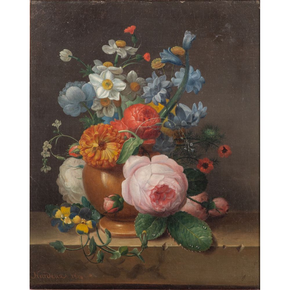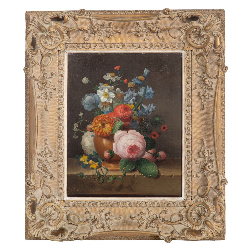 1840, signed, depicting a still life of flowers in a vase, in a weathered gesso on wood frame