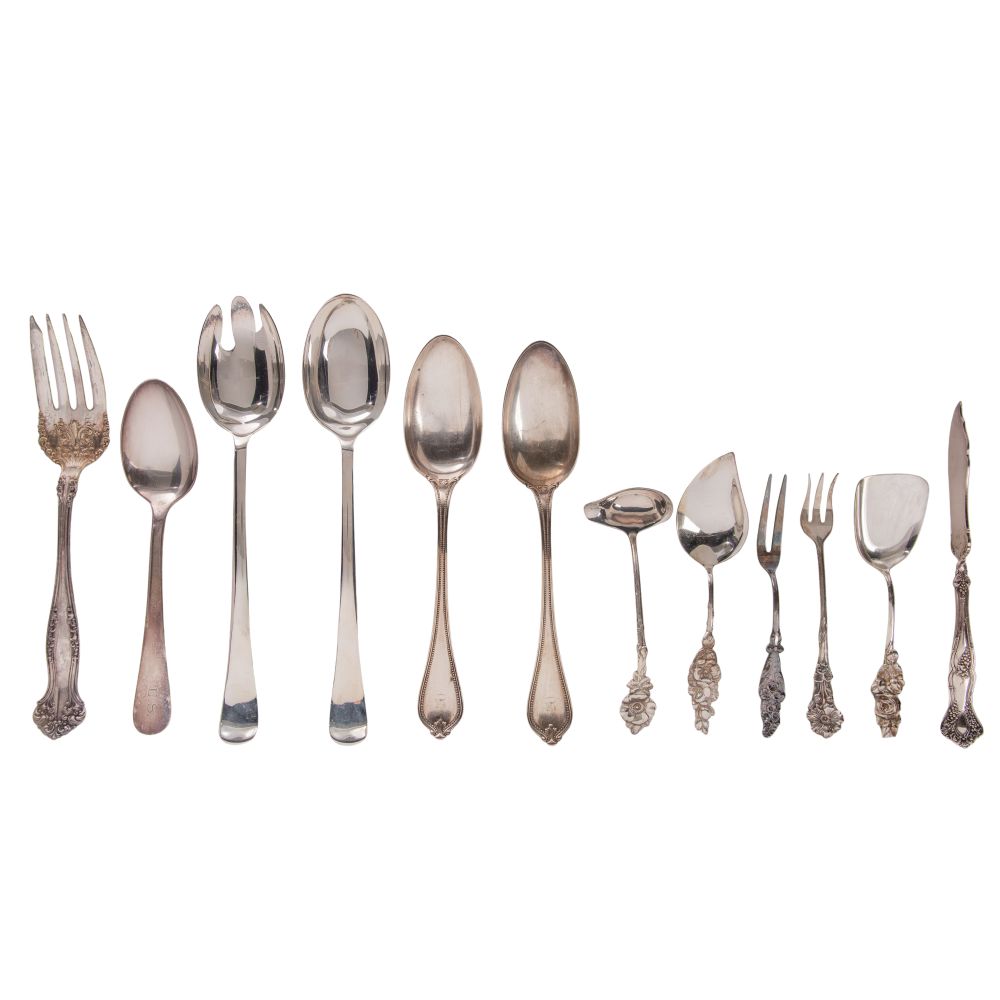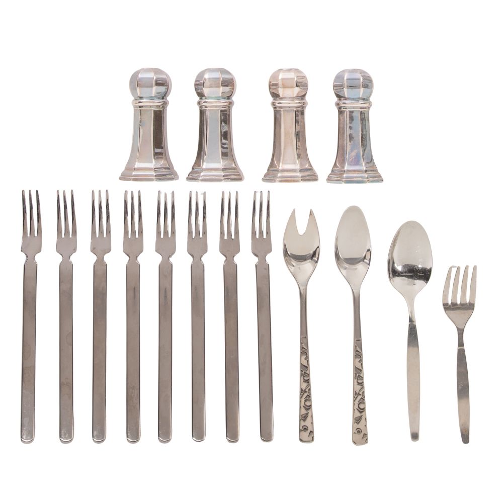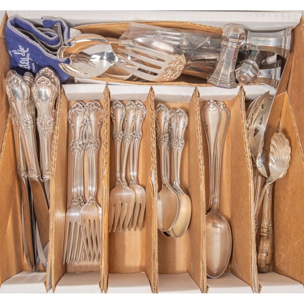 (71) total items including (9) 9 1/4-inch dinner knives, (8) 7 1/4-inch dinner forks, (8) 6-inch salad forks, (15) 6-inch teaspoons, (3) serving utensils and (2) serving spoons in a different pattern (all marked “sterling”); together with (22) silverplate and stainless steel utensils and (4) shakers