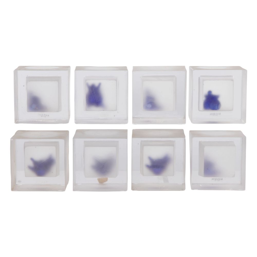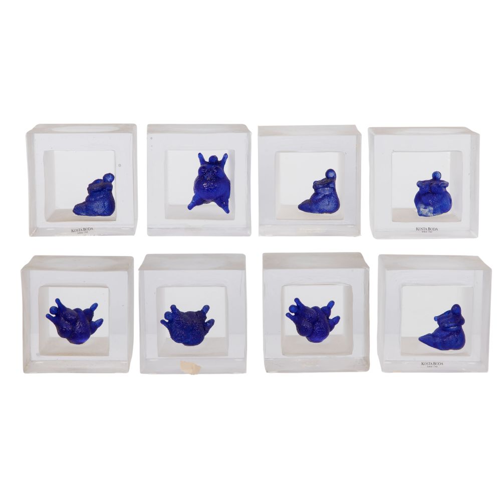 2000, (8) items all including a blue figure in various poses inside a cube having a frosted exterior, one side open, etched signature on the undersides, most having Kosta Boda sticker recto